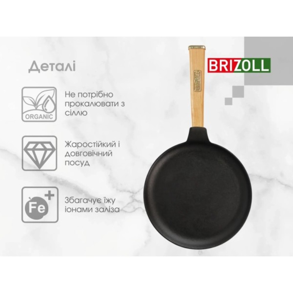Сковорода Brizoll Optima чавунна з ручкою для млинців для млинців виготовлена з литого чавуну, ручка виконана з вільхи, має ергономічну форму і зручно лежить у руці. В асортименті сковорода представлена в діаметрі 220 і 240 мм. Низький бортик 15 мм, забезпечує зручність у приготуванні млинців, оладок, грінок тощо.