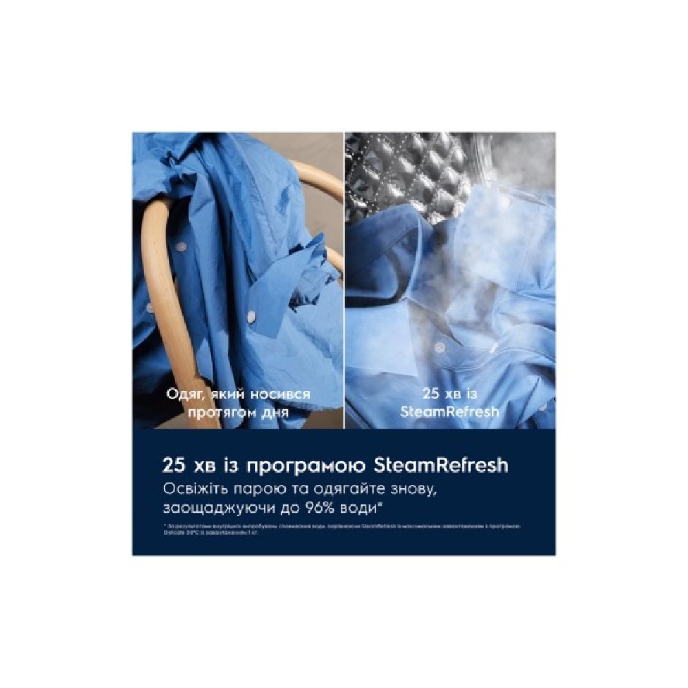 Система ароматизації FreshScent додатково подарує вашій білизні приємний аромат. Для тих, хто хоче економити час на прасуванні, програма SteamRefresh освіжає делікатний одяг всього за 25 хвилин, використовуючи менше води, ніж при звичайному пранні.