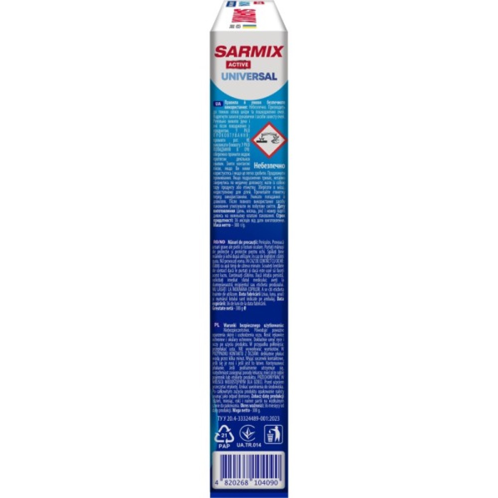 Пральний порошок SARMIX Active Universal призначений для прання виробів із бавовняних, лляних, синтетичних тканин, а також із змішаних волокон (крім виробів із натурального шовку та вовни).