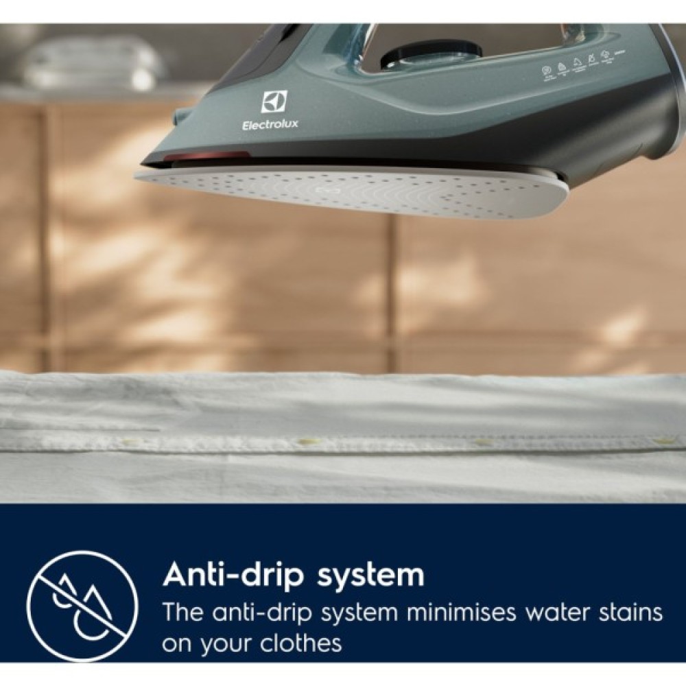 Мінімізуйте ризик появи слідів від води на одязі. Протикрапельна подвійна металева конструкція праски запобігає потраплянню води в парову камеру, коли температура занадто низька.