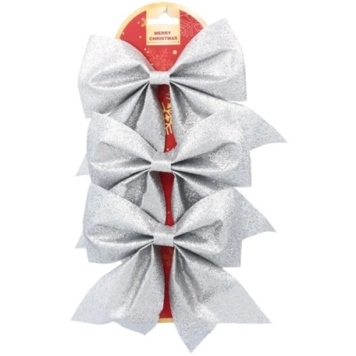 Сріблясті декоративні банти Chomik — це яскравий акцент для новорічного або святкового декору, що додає оформленню легкого блиску та витонченості. У наборі три банти розміром 16×14 см, виготовлені з текстилю, вкритого глітером, який створює ефект мерехтіння при будь-якому освітленні. Завдяки проволочному кріпленню, прикраси легко та надійно фіксуються на ялинкових гілках, подарунках або декоративних конструкціях. Вишуканий сріблястий колір чудово поєднується з білими, синіми та прозорими елементами декору.