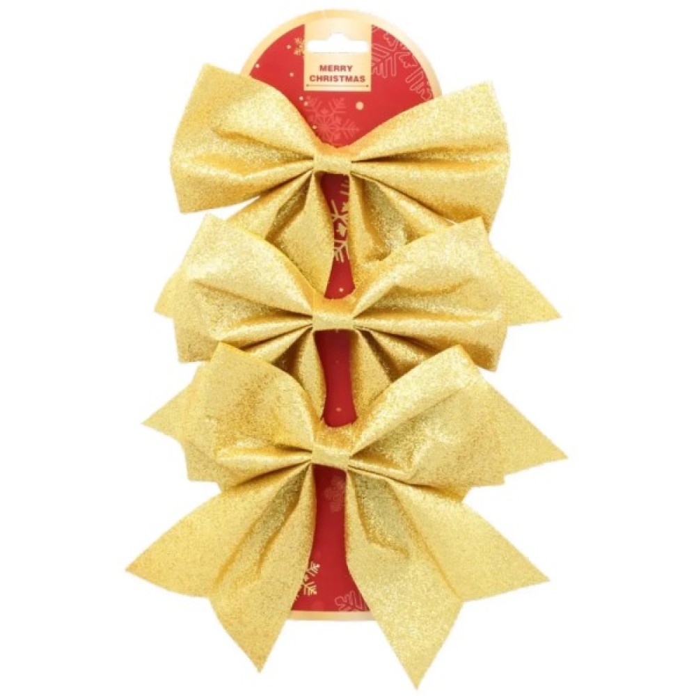 Набір декоративних бантів Chomik — це ефектний акцент для святкового оформлення, який додає простору блиску та урочистості. У комплект входять три великі банти розміром 16×14 см, виготовлені з текстилю з глітерним покриттям, що створює виражений ефект мерехтіння при освітленні. Золотистий колір підкреслює святковий настрій, а завдяки зручному кріпленню на проволоці банти легко закріпити на ялинці, подарунковому пакуванні, гірляндах чи інших елементах декору.