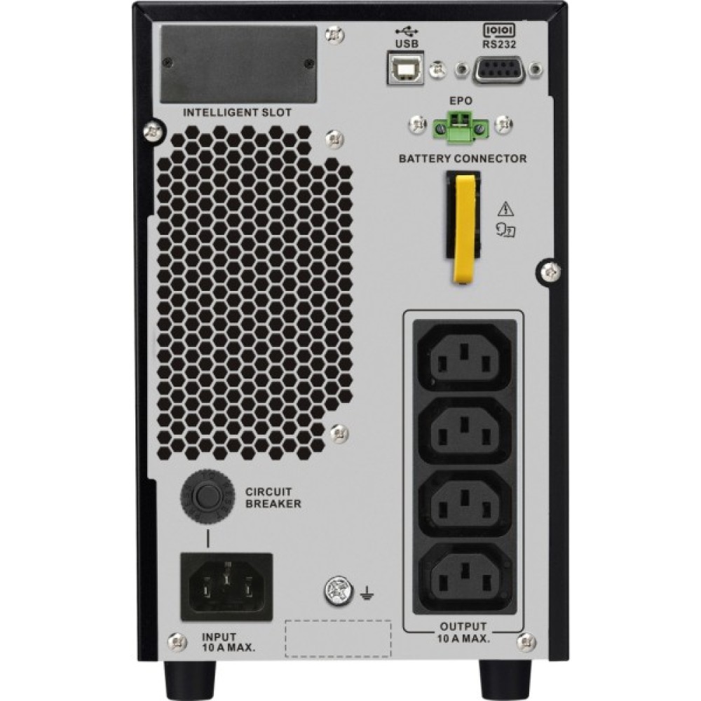 Пристрій оснащений чотирма IEC розетками, що дозволяє під'єднувати кілька пристроїв для одночасного живлення. Інтерфейси SmartSlot, USB та RS-232 надають гнучкість у налаштуванні та моніторингу UPS, дозволяючи управляти станом та параметрами роботи з максимальною зручністю.