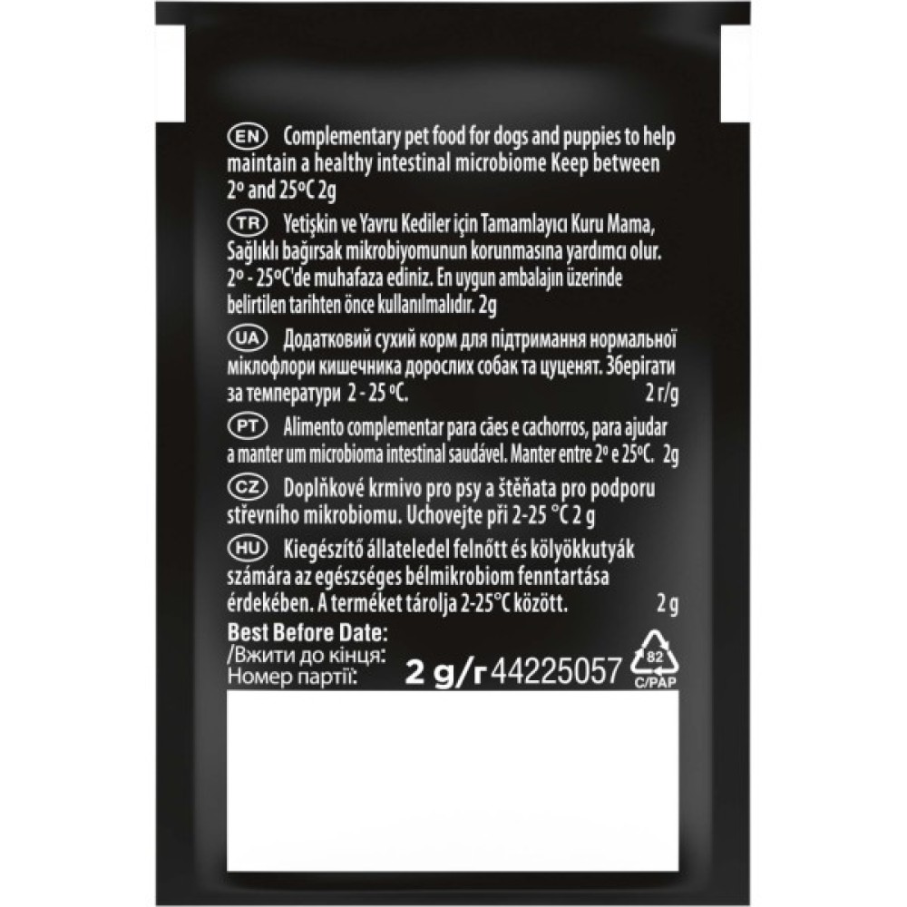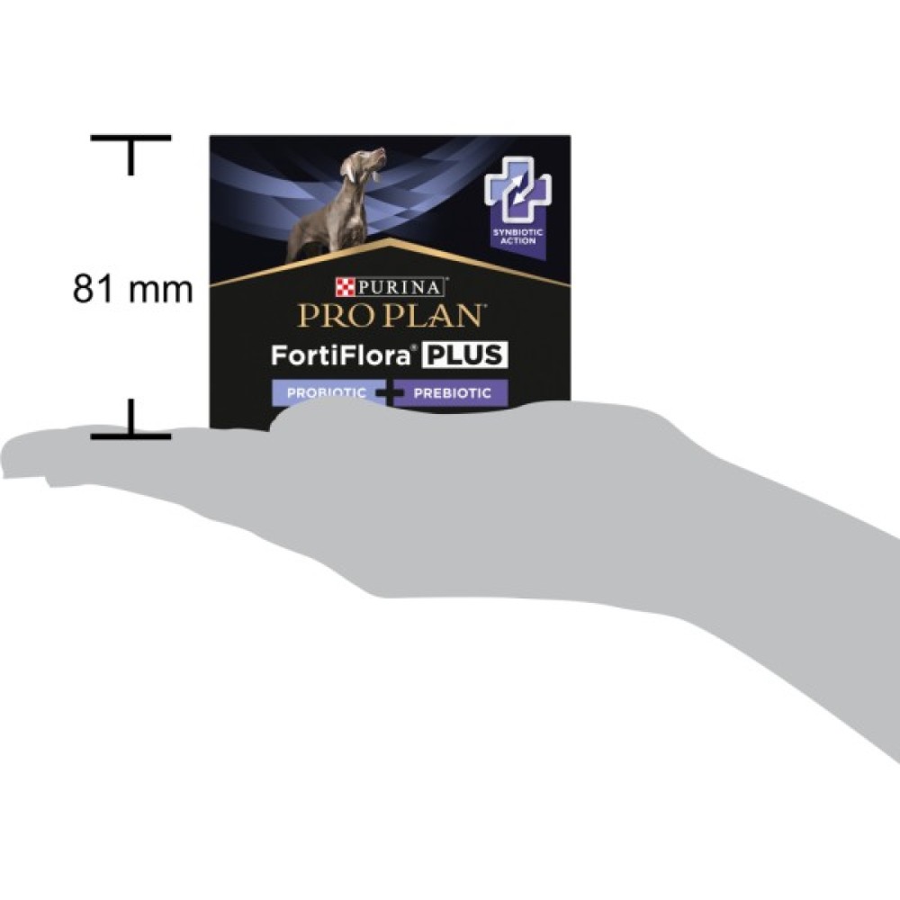 Purina Pro Plan FortiFlora Plus (Плюс) - додатковий корм для дорослих собак і цуценят (після відлучення від матері) з синбіотичною дією пребіотика і пробіотика. Сприяє підтримці здорового мікробіома, його балансу та зміцненню імунного захисту. Кожне саше містить гарантований рівень пробіотичних бактерій (мікрокапсульованих для підвищення стабільності в середовищі та ефективності) у поєднанні з пребіотиком рослинного походження.