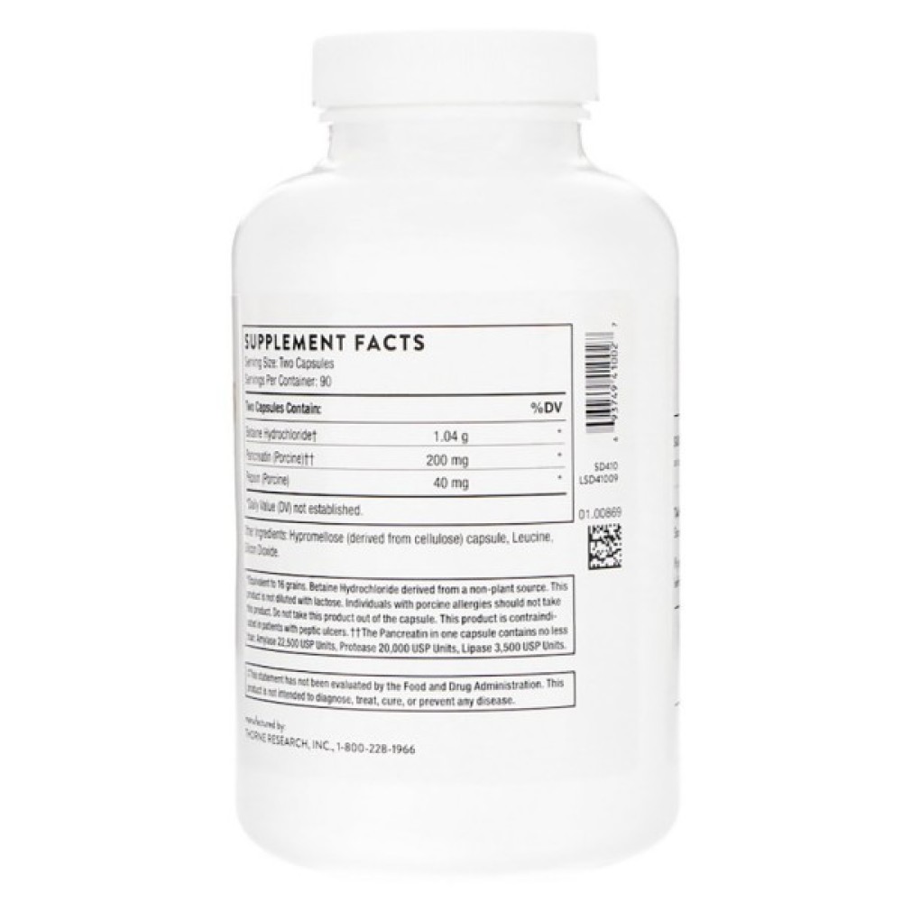 Дана формула від Thorne Research розроблена спеціально для того, що б забезпечити ефективну підтримку травленню. Бетаїн HCL з пепсином та Панкреатином покликані налагодити травлення і роботу шлунково-кишкового тракту. Часті закрепи або діарея, деякі алергічні реакції і навіть часті дріжджові інфекції можуть бути причиною низького рівня соляної кислоти. Прийом 1 таблетки в день бетаина Hcl з пепсином, усуне дискомфорт і налагоджує роботу шлунково-кишкового тракту. Крім того, ця формула знижує рівень гомо цистеїну, що позитивно впливає на серцево-судинну систему. Панкреатин - забезпечує підшлунковій залозі відсутні ферменти і сприяє посиленню розщеплення білків, вуглеводів і жирів у дванадцятипалій кишці.