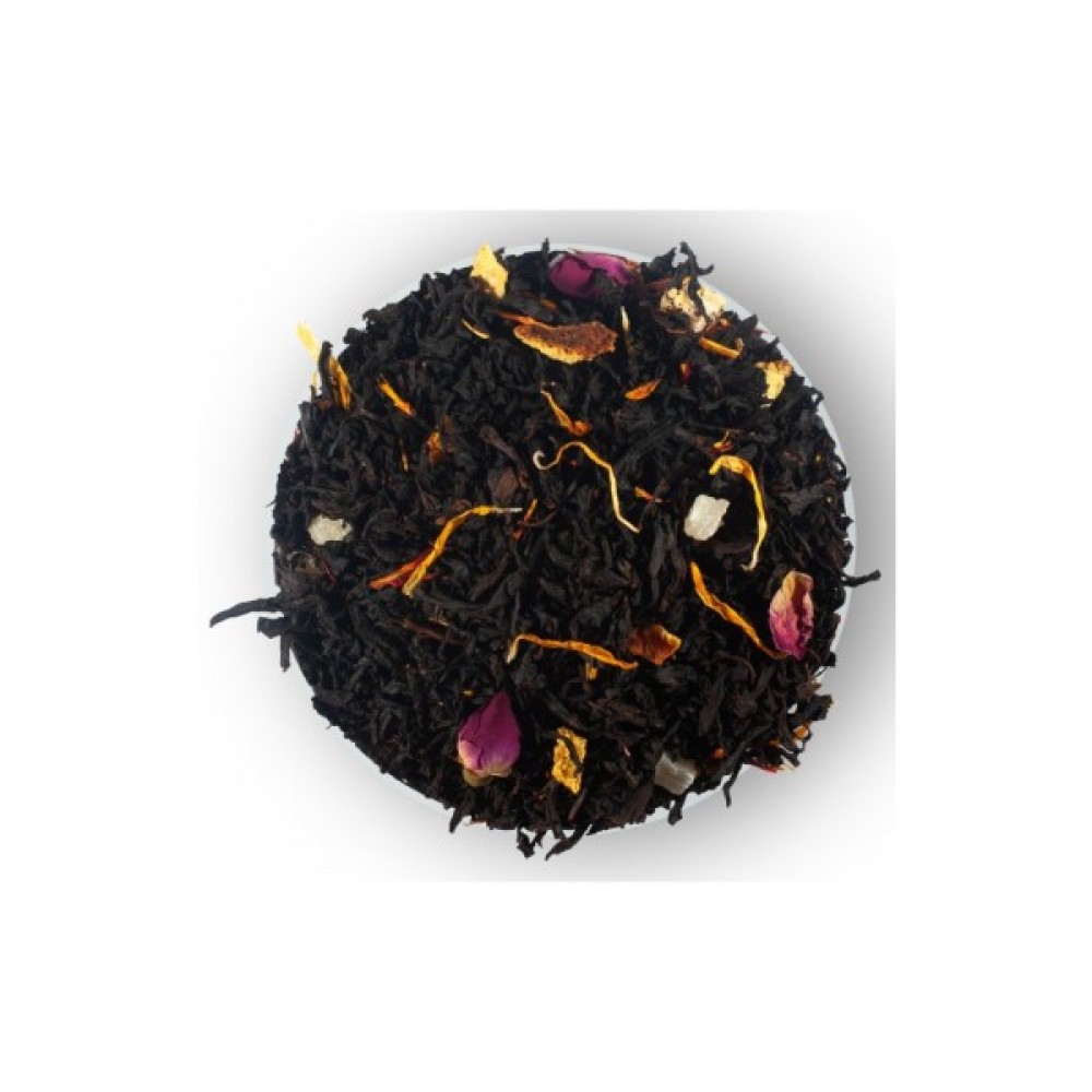 Чудова чайна суміш Пристрасний фрукт від Lovare — чай чорний цейлонський байховий листовий, цедра апельсина, шматочки персика й ананаса, бутони китайської троянди, пелюстки календули та сафлору, натуральний ароматизатор «Персик».