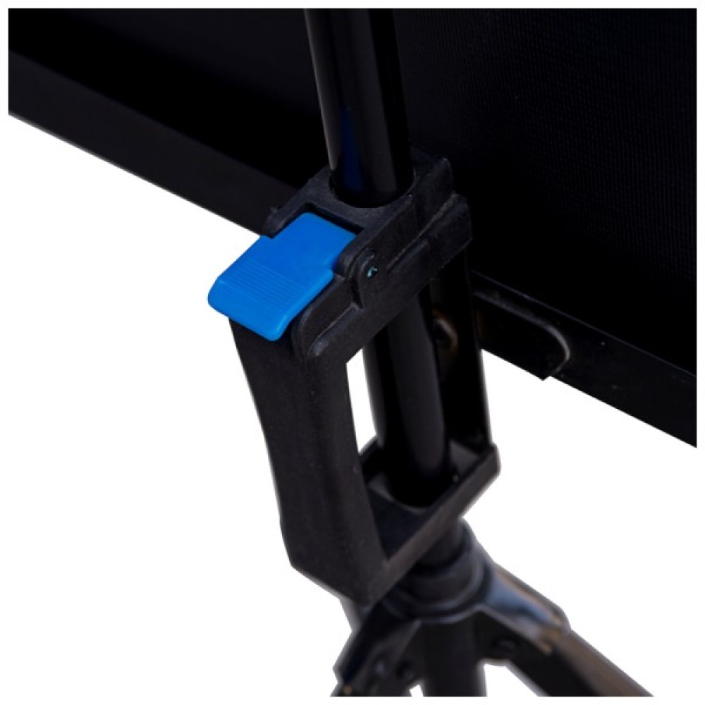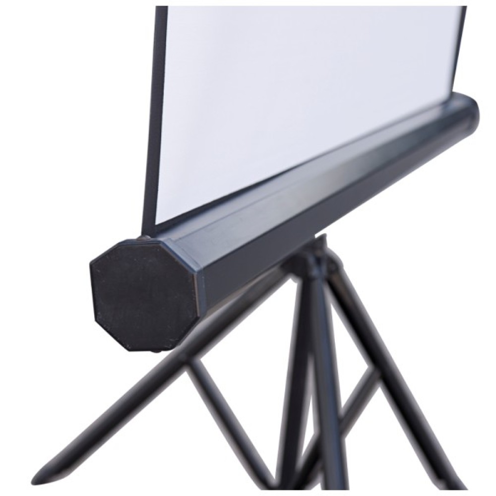 Мобільний екран ATRIA TRM-NTSC-120D з триногою у міцному корпусі, придатний для щоденного використання. Механізм автоматичного блокування управляє регулюванням висоти. Чорна оборотна сторона матеріалу запобігає проникненню світла.