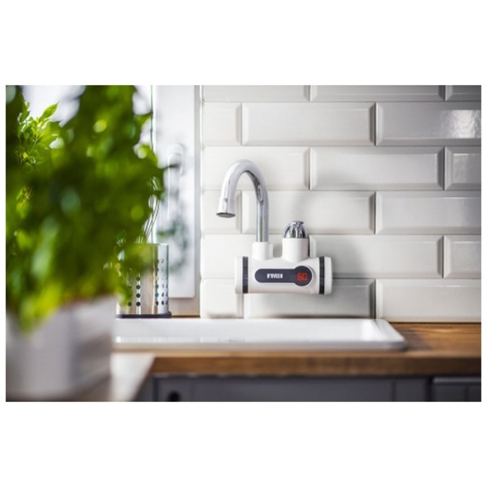 Електричний проточний водонагрівач IWH350 монтується на стіну та ідеально підходить для кухні, дачі або підсобного приміщення. Максимальна температура нагріву води – 60 °С.
