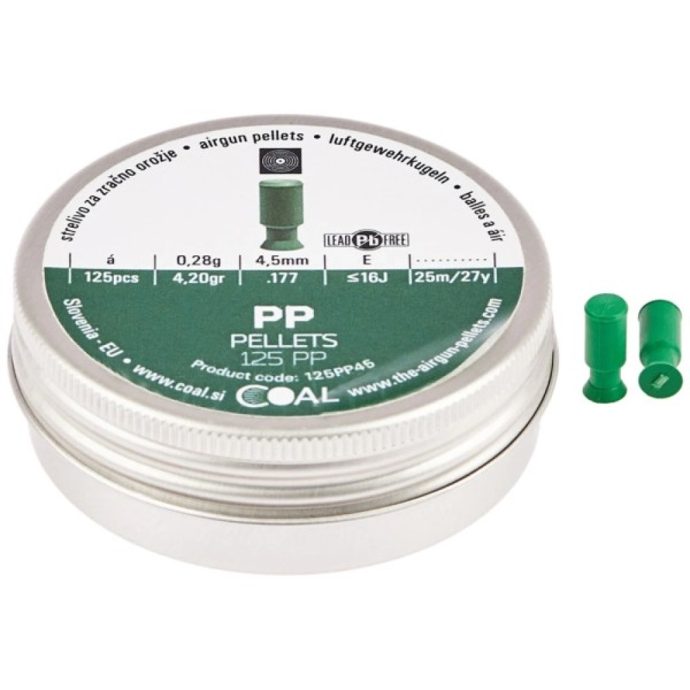 Лінійка безсвинцевих поліпропіленових куль PP з плоскою головкою Coal, які підходять для спортивної стрільби з пневматичної зброї калібру 4,5 мм. Вони дуже легкі та ідеальні для стрільби по мішенях.