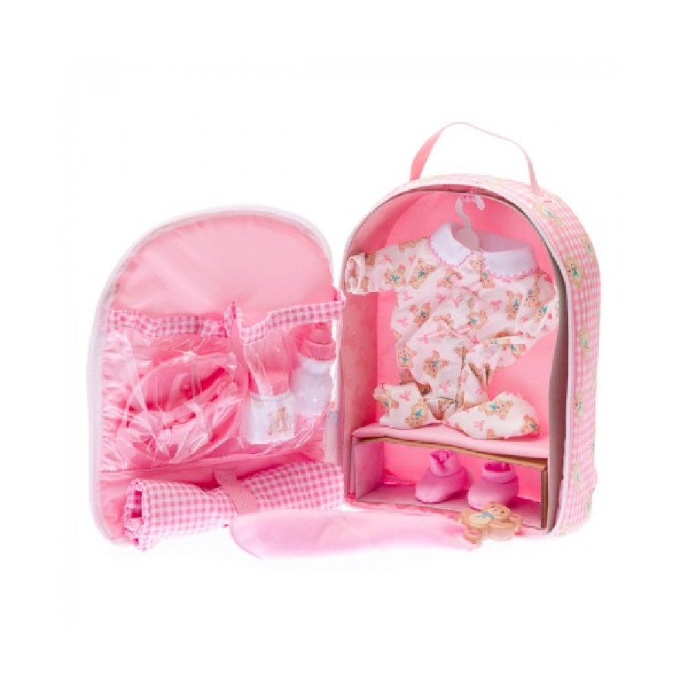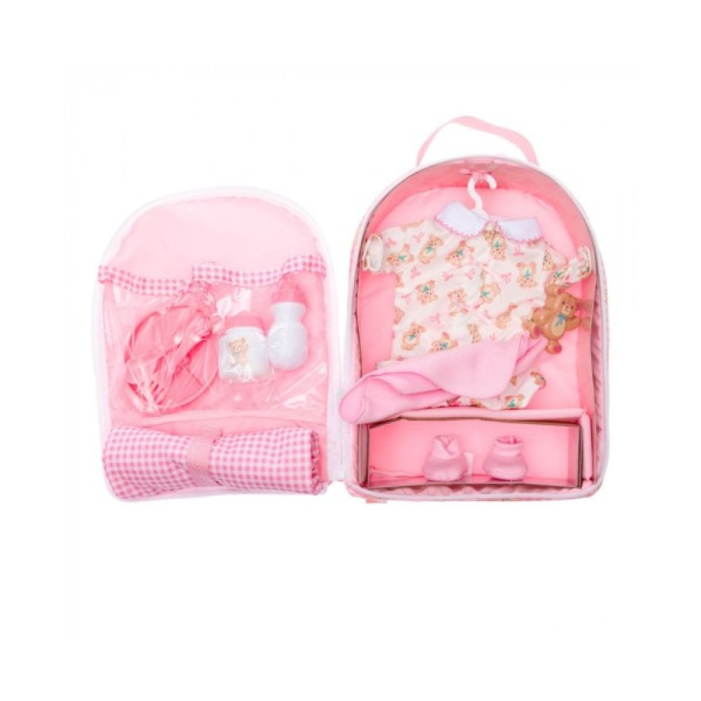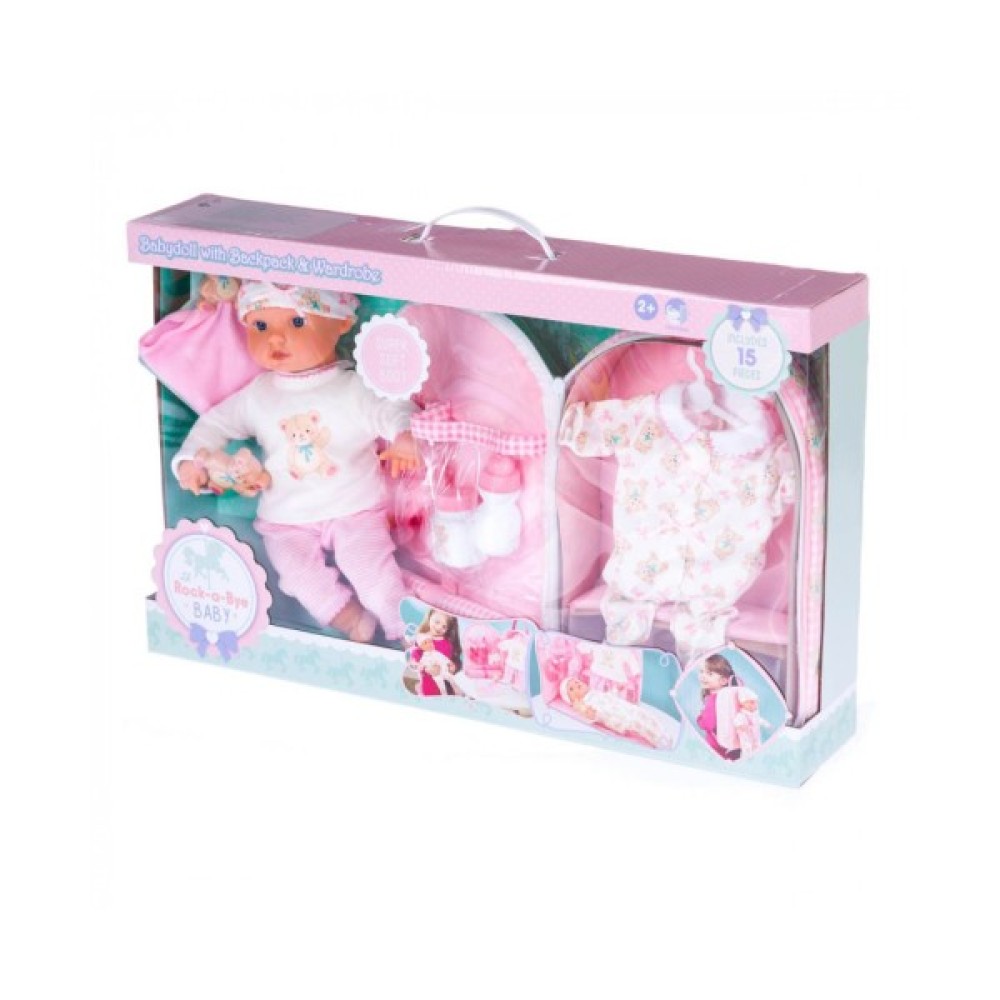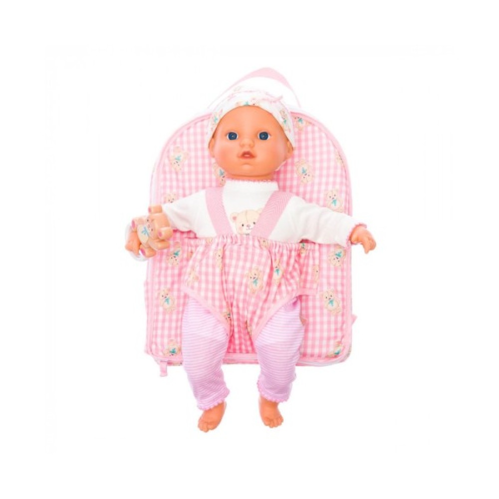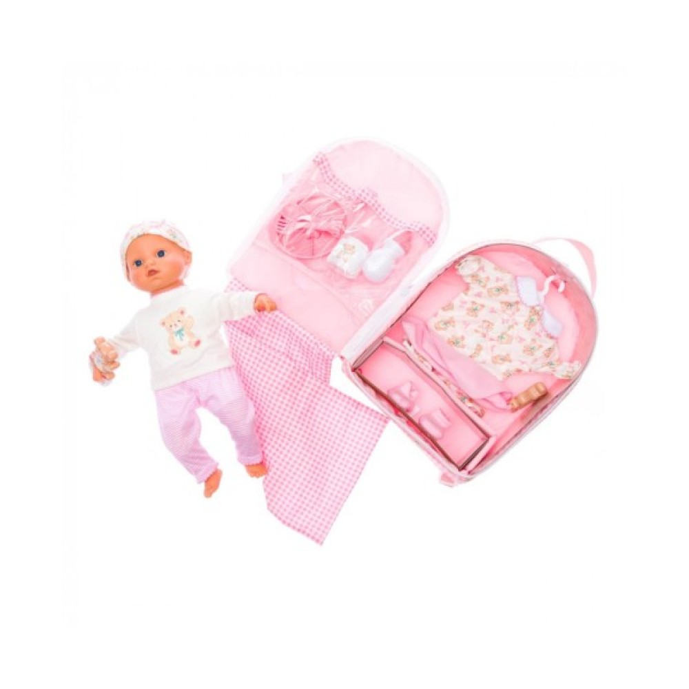 Симпатичний пупс стане приємним подарунком для дівчинки старше 2 років. М'яконабивний пупс одягнений в костюм і шапочку, в комплекті також представлена мила піжама. Дитина зможе відчути себе дійсно дорослою і проявити турботу, оскільки в набір також входить посуд і брязкальце для іграшкового малюка. Всі елементи комплекту зібрані в симпатичний рюкзачок, який можна використовувати в якості пеленатора і переноски для ляльки. Голова і руки пупса зроблені з якісного пластику, тіло – м'яконабивне. Висота пупса 35, 5 см.