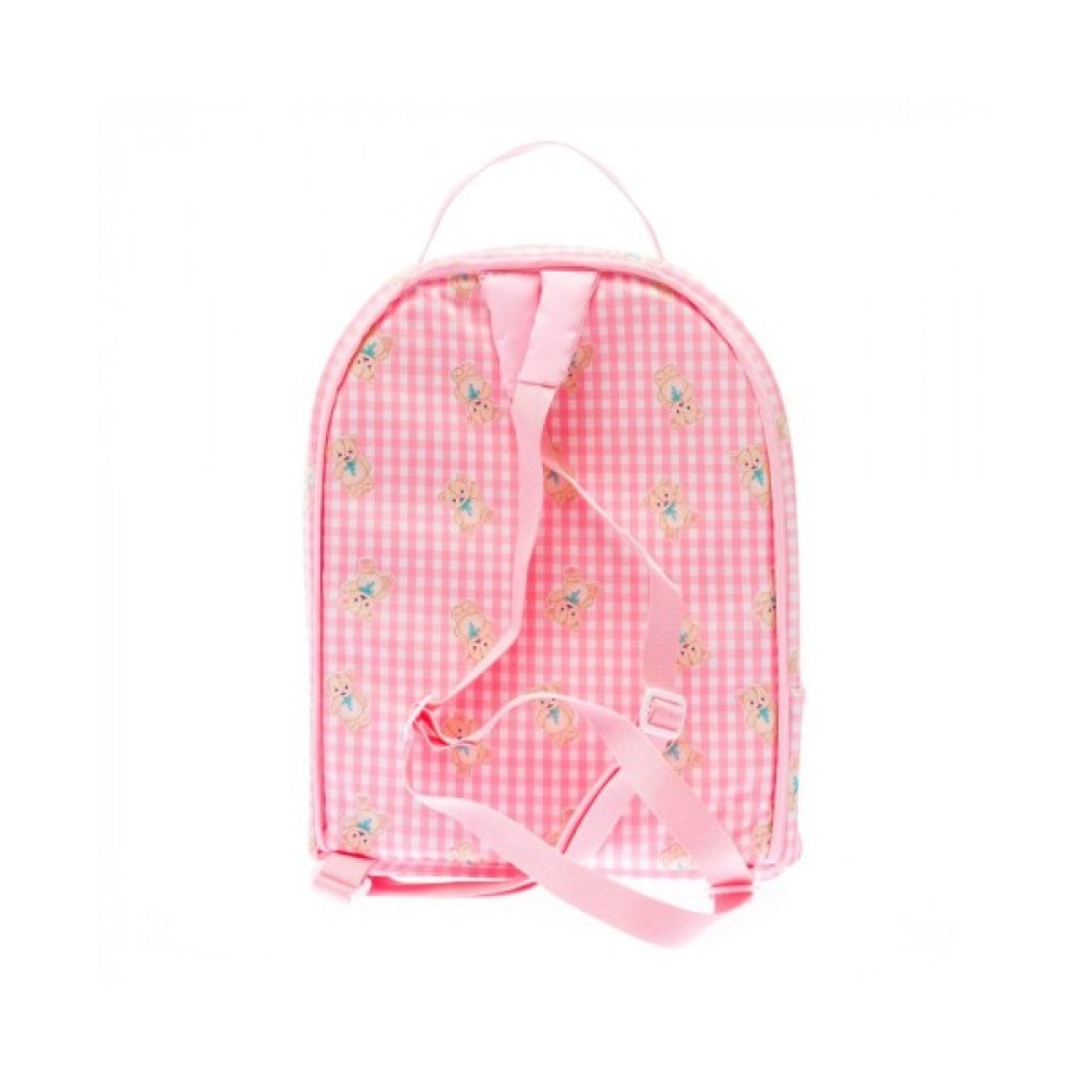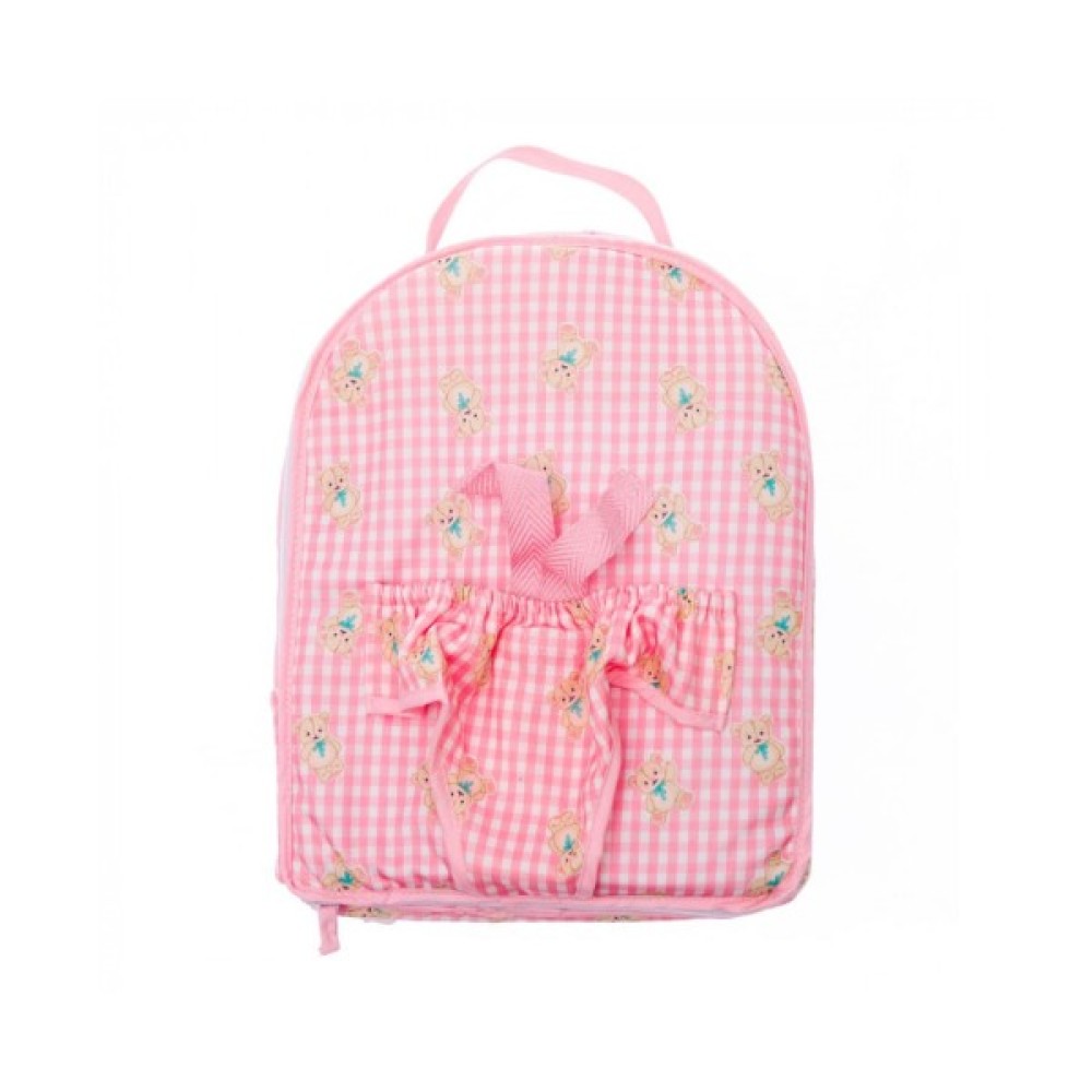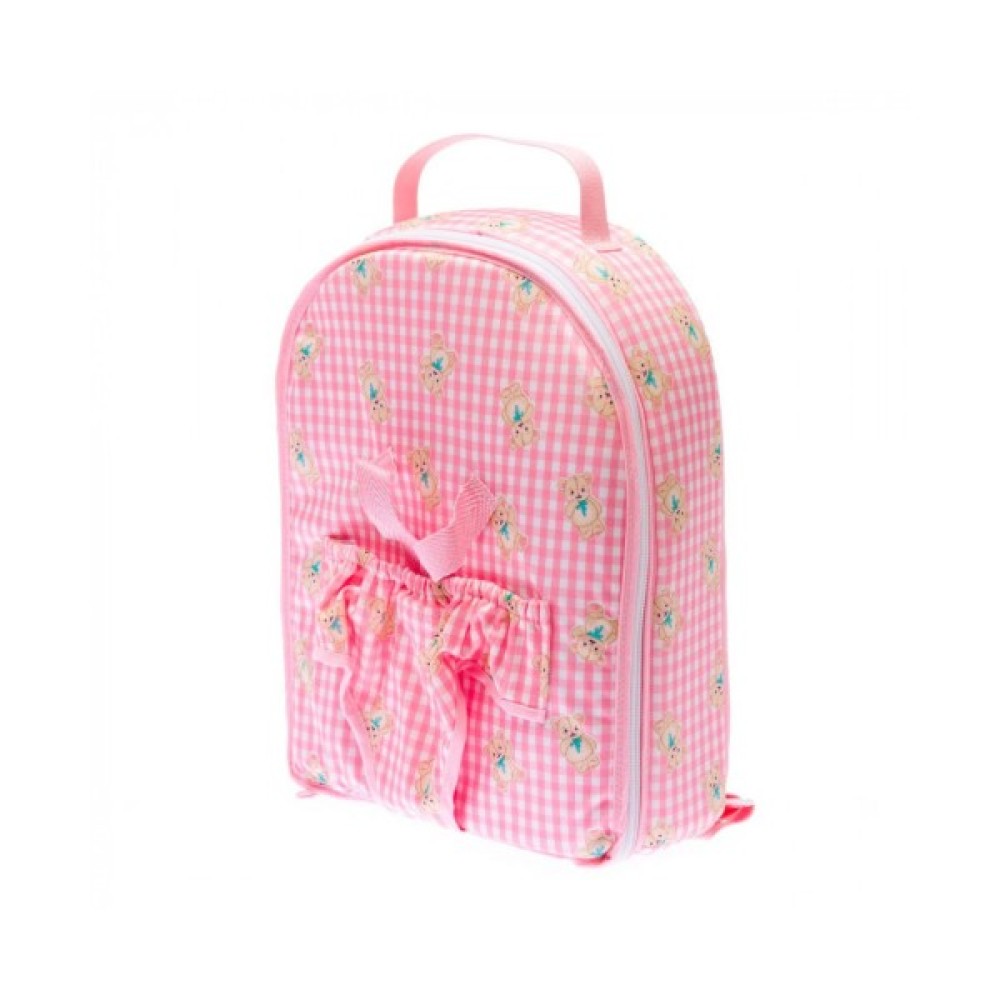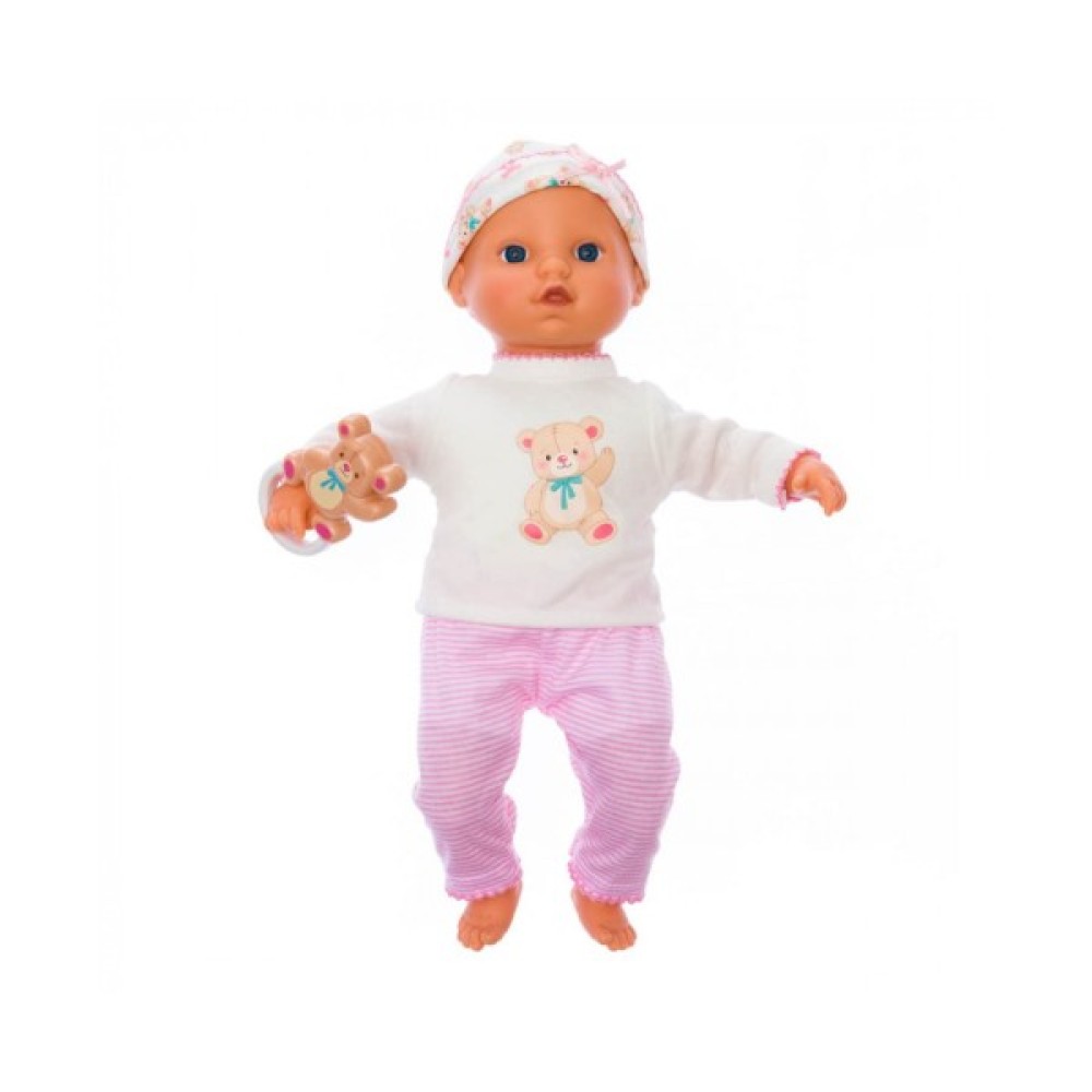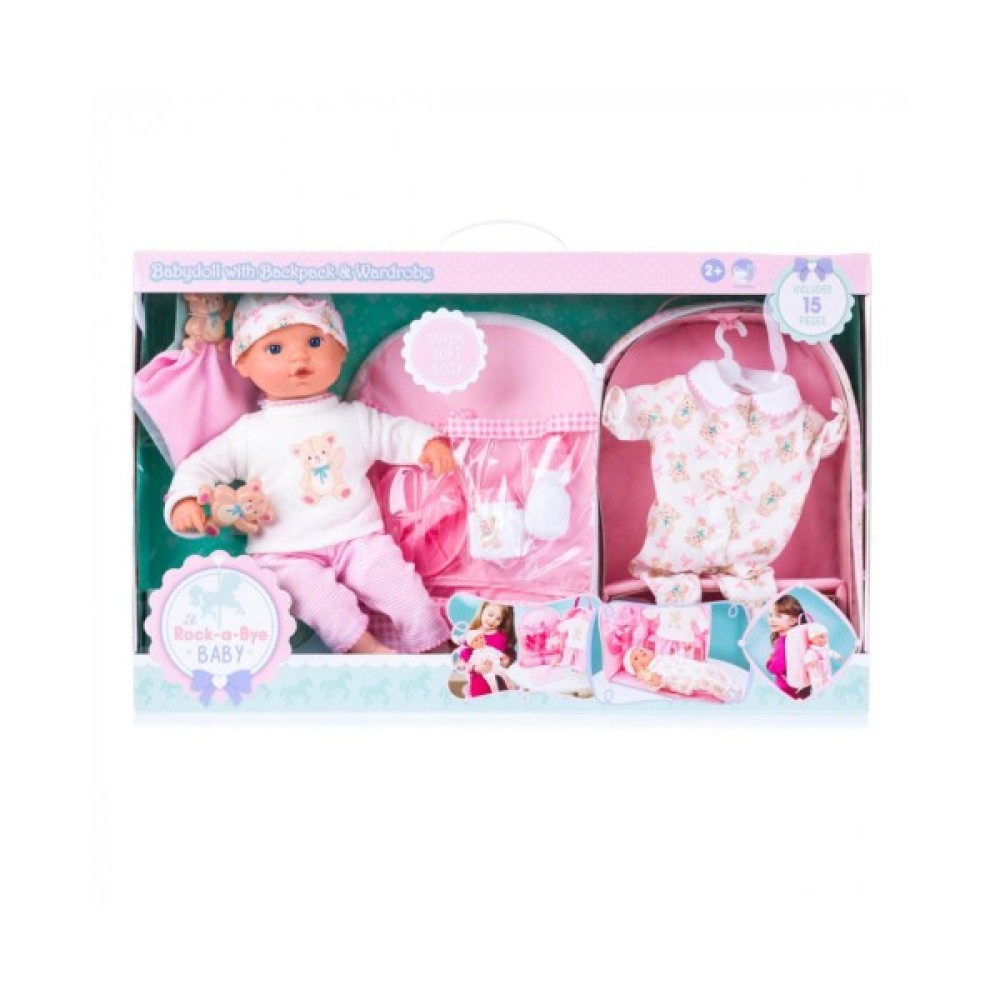 Симпатичний пупс стане приємним подарунком для дівчинки старше 2 років. М'яконабивний пупс одягнений в костюм і шапочку, в комплекті також представлена мила піжама. Дитина зможе відчути себе дійсно дорослою і проявити турботу, оскільки в набір також входить посуд і брязкальце для іграшкового малюка. Всі елементи комплекту зібрані в симпатичний рюкзачок, який можна використовувати в якості пеленатора і переноски для ляльки. Голова і руки пупса зроблені з якісного пластику, тіло – м'яконабивне. Висота пупса 35, 5 см.