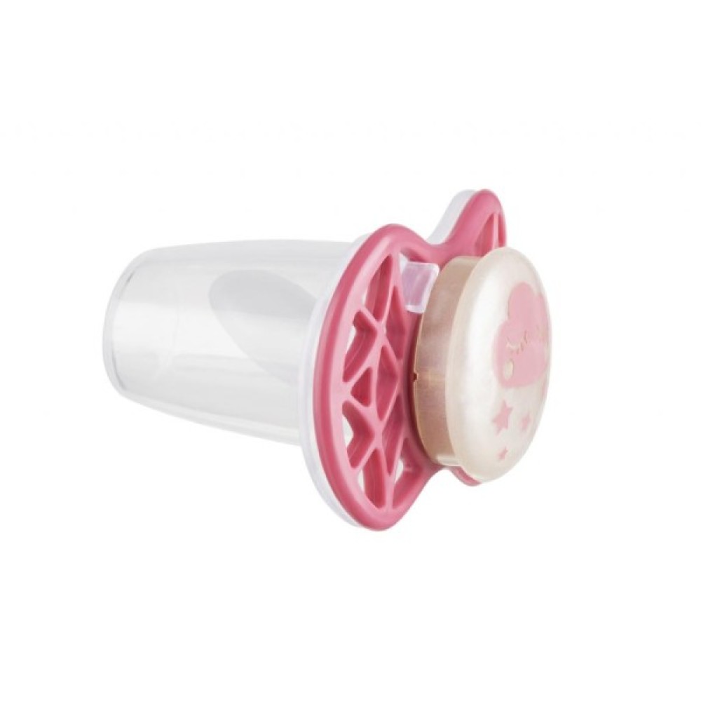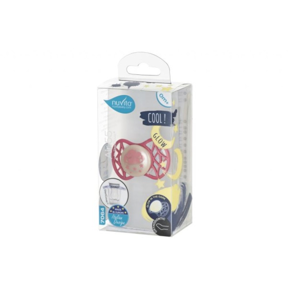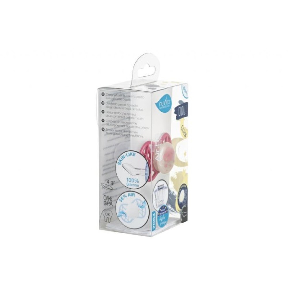 Ортодонтична пустушка Air55 Cool, яка світиться в темряві. Платівка соски на 55% складається з повітря забезпечуючи майже повну аерацію області навколо рота, уникаючи скупчення слини, яка може дратувати шкіру. Захисний ковпачок для соски для підтримки чистоти соски і стерилізації в мікрохвильовій печі простим додаванням води.