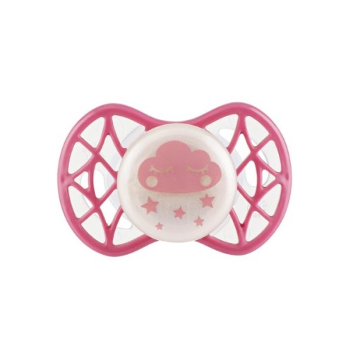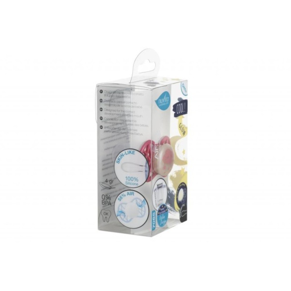 Симетрична пустушка Air55 Cool, яка світиться в темряві. Пластина соски на 55% складається з повітря, забезпечуючи майже повну аерацію області навколо рота, уникаючи скупчення слини, яка може дратувати шкіру. Захисний ковпачок для соски для підтримки чистоти соски і стерилізації в мікрохвильовій печі простим додаванням води.