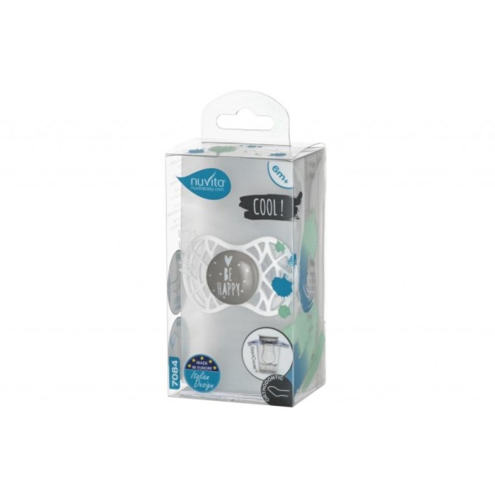 Ортодонтична пустушка серії Nuvita Air55 Cool 6m+. Пластина соски на 55% складається з повітря забезпечуючи майже повну аерацію області навколо рота, уникаючи скупчення слини, яка може подразнювати шкіру. Захисний ковпачок для соски для підтримки чистоти соски і стерилізації в мікрохвильовій печі простим додаванням води.