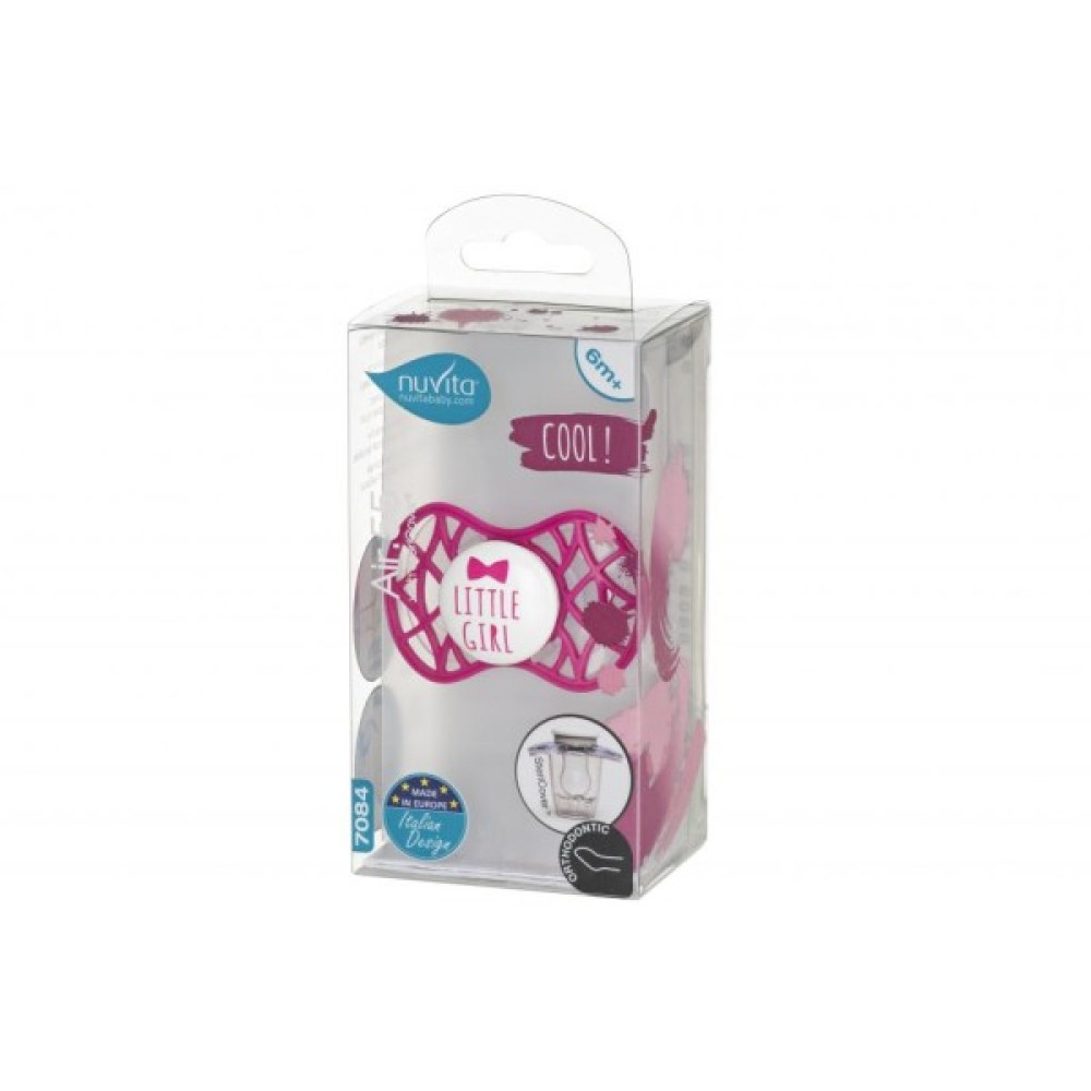 Пустушка ортодонтична Nuvita NV7084 Air55 Cool 6m + "LITTLE GIRL" яскраво-рожева. Пластина соски на 55% складається з повітря забезпечуючи майже повну аерацію області навколо рота, уникаючи скупчення слини, яка може подразнювати шкіру. Захисний ковпачок для соски для підтримки чистоти соски і стерилізації в мікрохвильовій печі простим додаванням води.