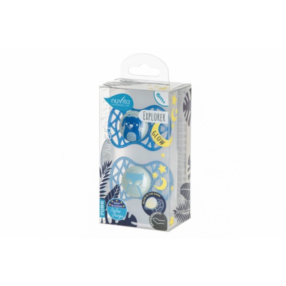 Пустушка Nuvita NV7086 Air55 Explore ортодонтическая 6m + світиться в темряві (собачка, лисиця). Пластина соски на 55% складається з повітря забезпечуючи майже повну аерацію області навколо рота, уникаючи скупчення слини, яка може подразнювати шкіру.
