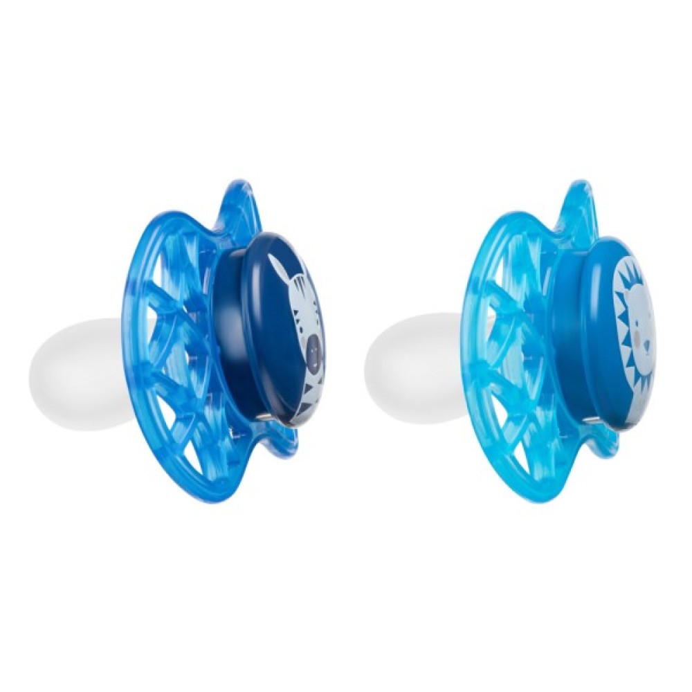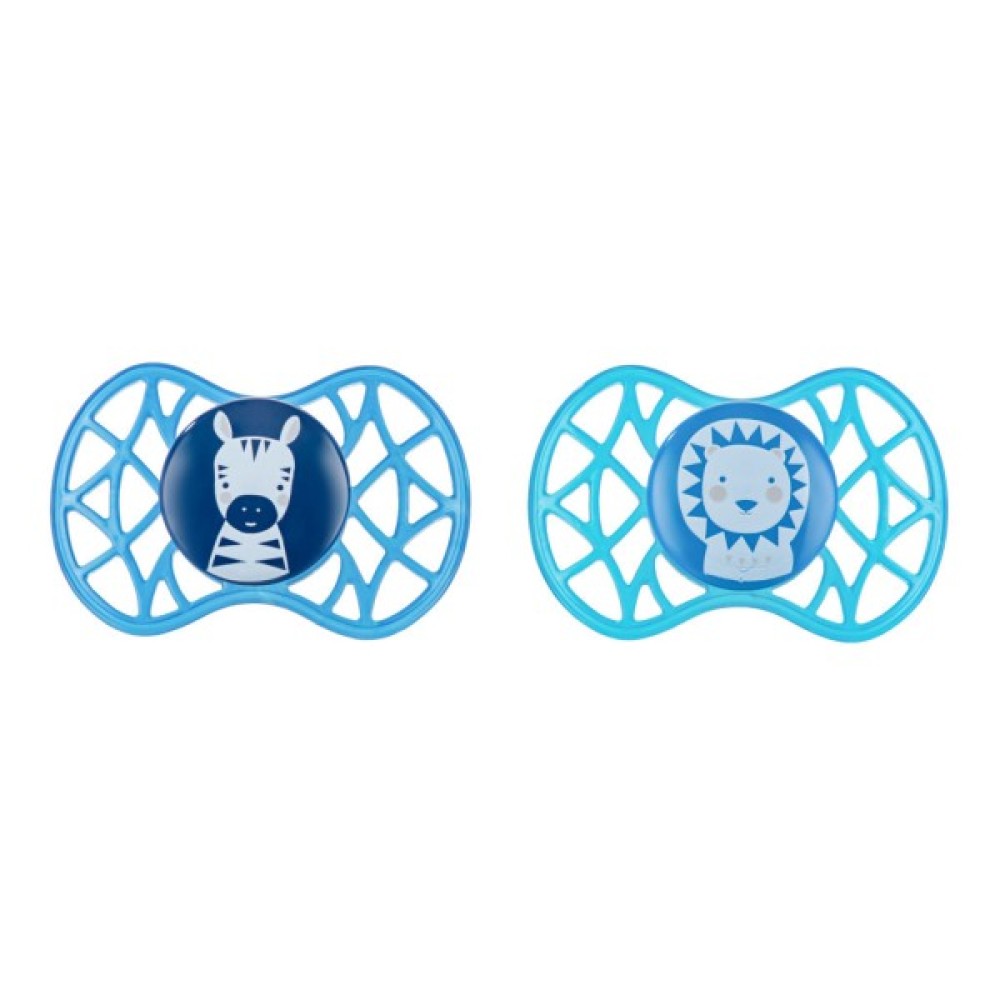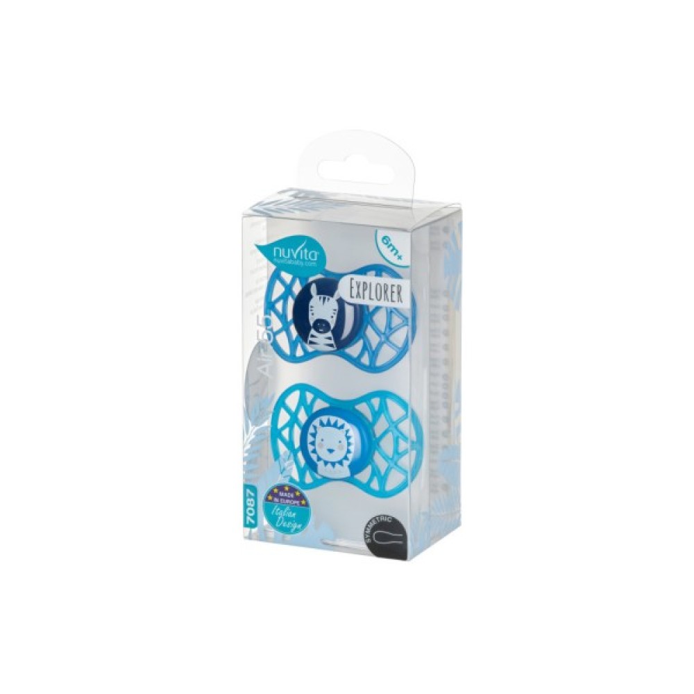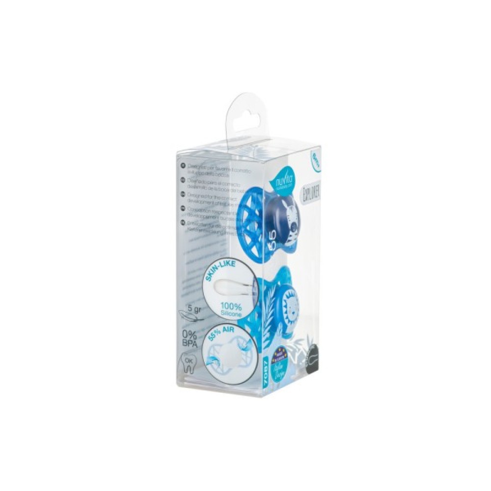 Пустушка Air55 Explore симетрична. Пластина соски на 55% складається з повітря забезпечуючи майже повну аерацію області навколо рота, уникаючи скупчення слини, яка може подразнювати шкіру.