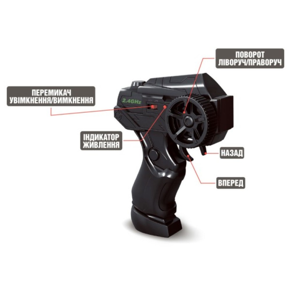 - живлення –; 2 батарейки типу АА для пульта керування (в комплект не входять), 3 батарейки типу АА для машинки (в комплект не входять).