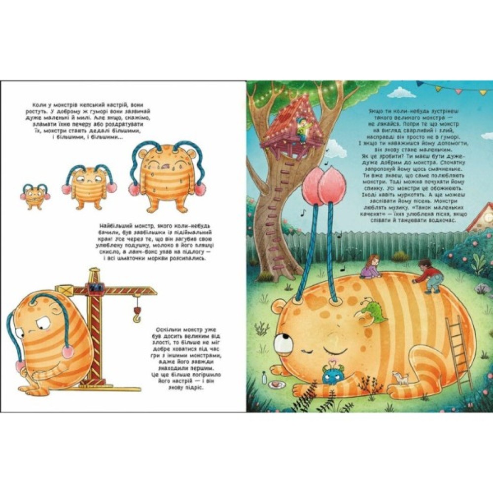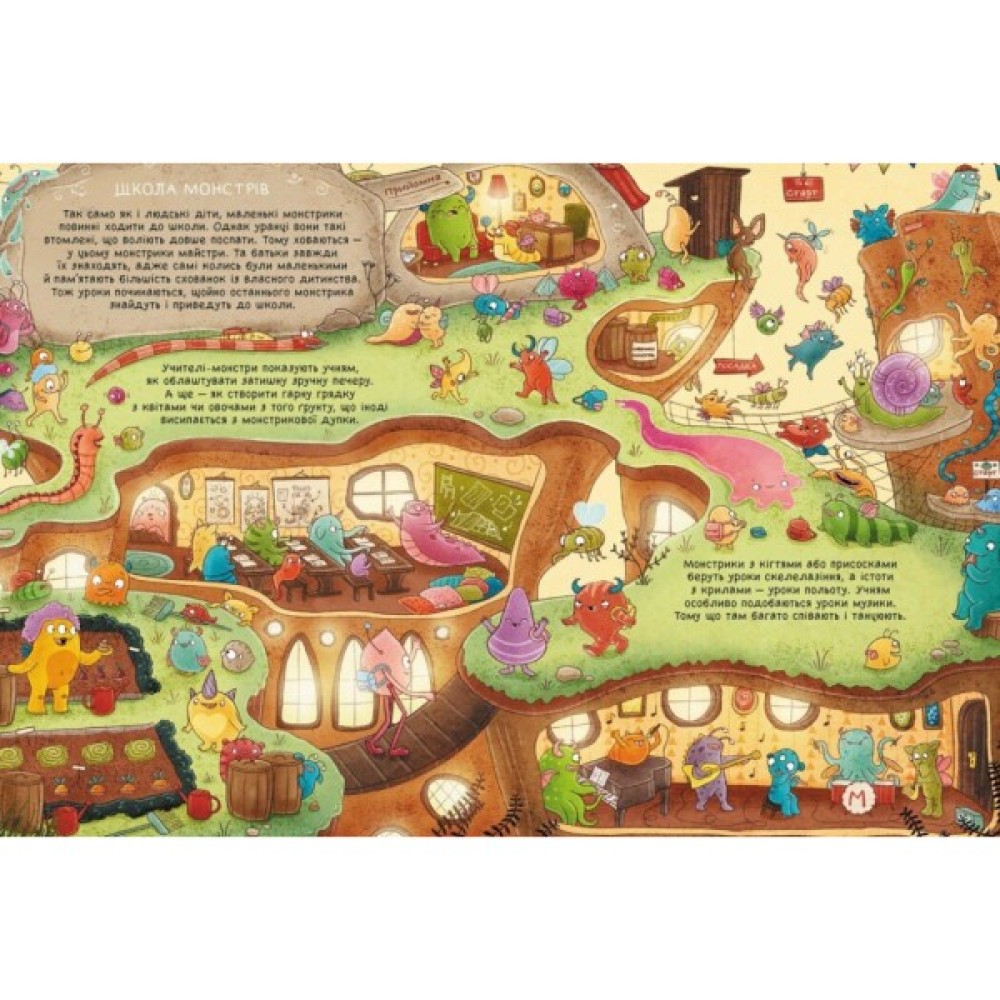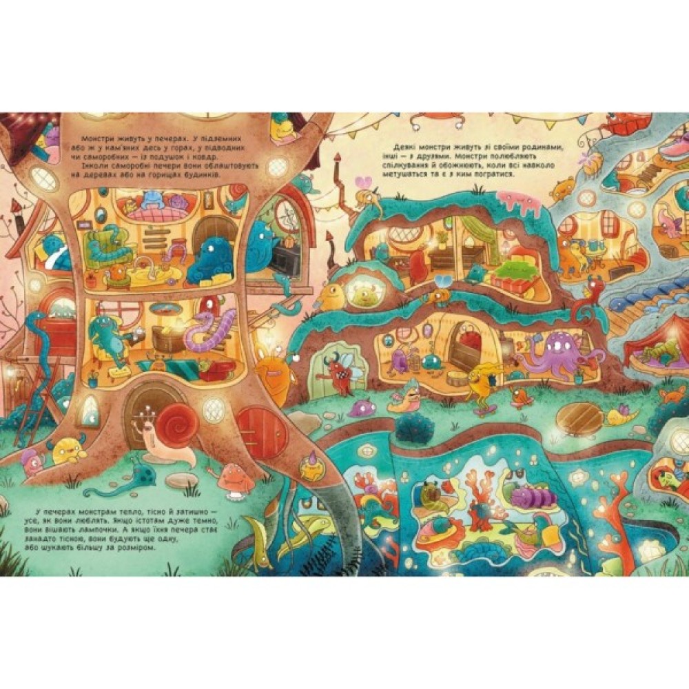Усе-усе про монстрів в одній яскравій книжці. Тепер немає сенсу боятися цих страховиськ, адже вони, виявляється, такі милі й багато в чому нагадують дітей. Полюбляють смачненьке, грають у хованки-наздоганялки, ходять до школи, хоча й не хочуть рано прокидатися. А ще облаштовують собі домівки-печери під землею, під водою, в горах... або ж просто вдома із ковдр. Напрочуд цікаво роздивлятися монстрів і монстриків на веселих ілюстраціях.