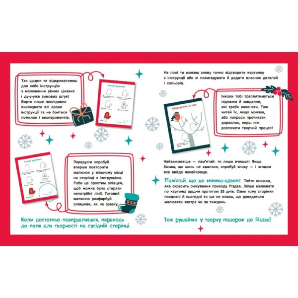 Дитина з нетерпінням чекає на зимові свята? Ця адвент-читанка зробить очікуванням особливим! У книжці є 25 різдвяних оповідань, де кожна нова історія починається з того, чим закінчилась попередня. Окрім затишних оповідок, тут є цікавезні завдання на щодень: загадки, розмальовки, ребуси й лабіринти.