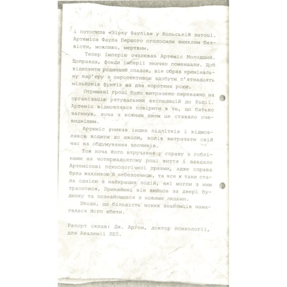 Від одного звуку його імені вороги здригаються. І дійсно, Артеміс Фаул уміє справити незабутнє враження. Цей юний геній вирізняється неймовірною гостротою мислення, миттєвою реакцією і повною відсутністю страху. Декому він здається машиною. Але це не так. Попри всі свої досягнення і блискучі кримінальні операції, Артеміс залишається тринадцятирічним хлопцем, здатним на сильні почуття і готовим на все, щоб урятувати дорогу йому людину...