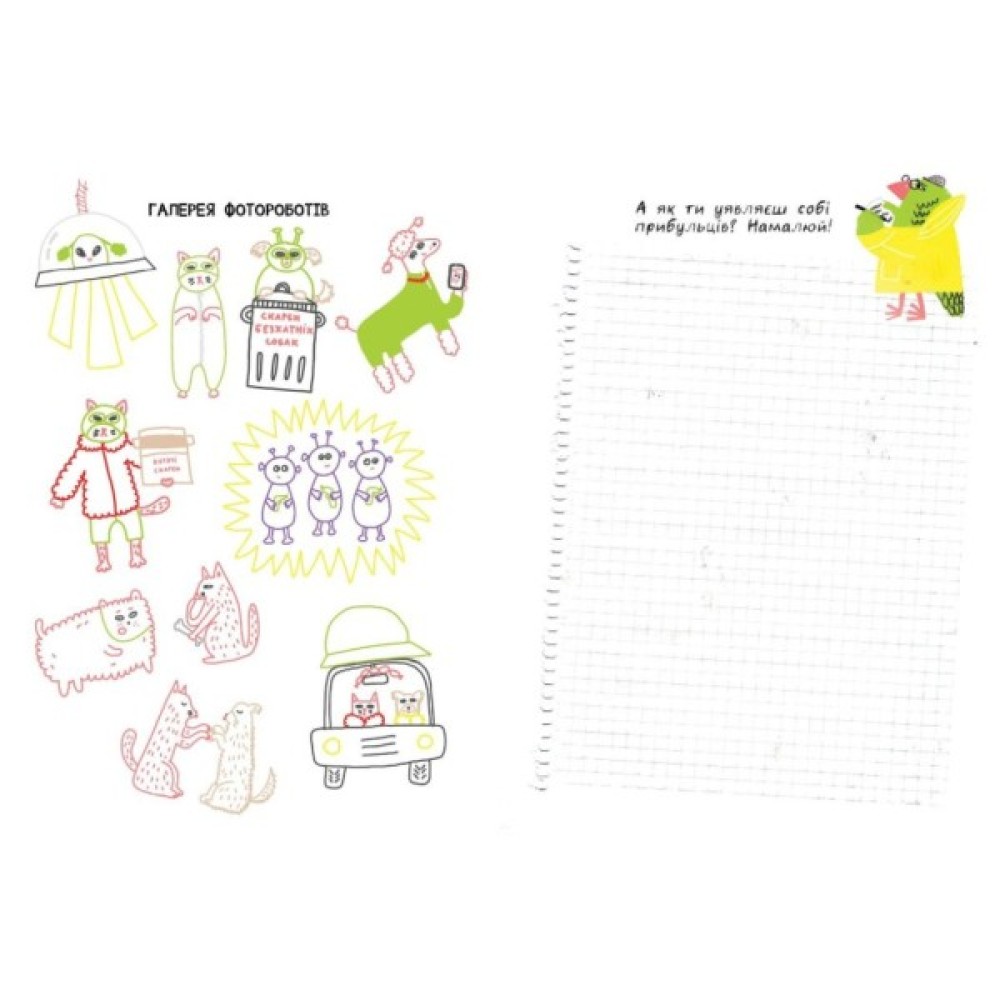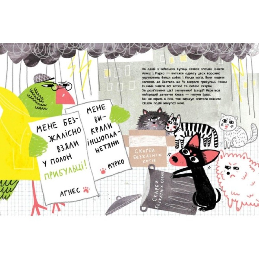 У Києві стався гучний злочин. Зникли Агнес і Мурко — ватажки банд собак і котів. І все вказує на те, що їх викрали прибульці. Але це ну ду-у-уже дивно! За підозрілу справу береться найкращий київський детектив — папуга Брюс. Але навіть він не впорається без ТВОЄЇ допомоги. Візьми олівець, уважно прочитай описи злочинців — і зрештою склади фотороботи підозрюваних. На чому прилітали прибульці? Який вони мали вигляд? І чи справді то було НЛО? Викрий злочинців завдяки творчості!