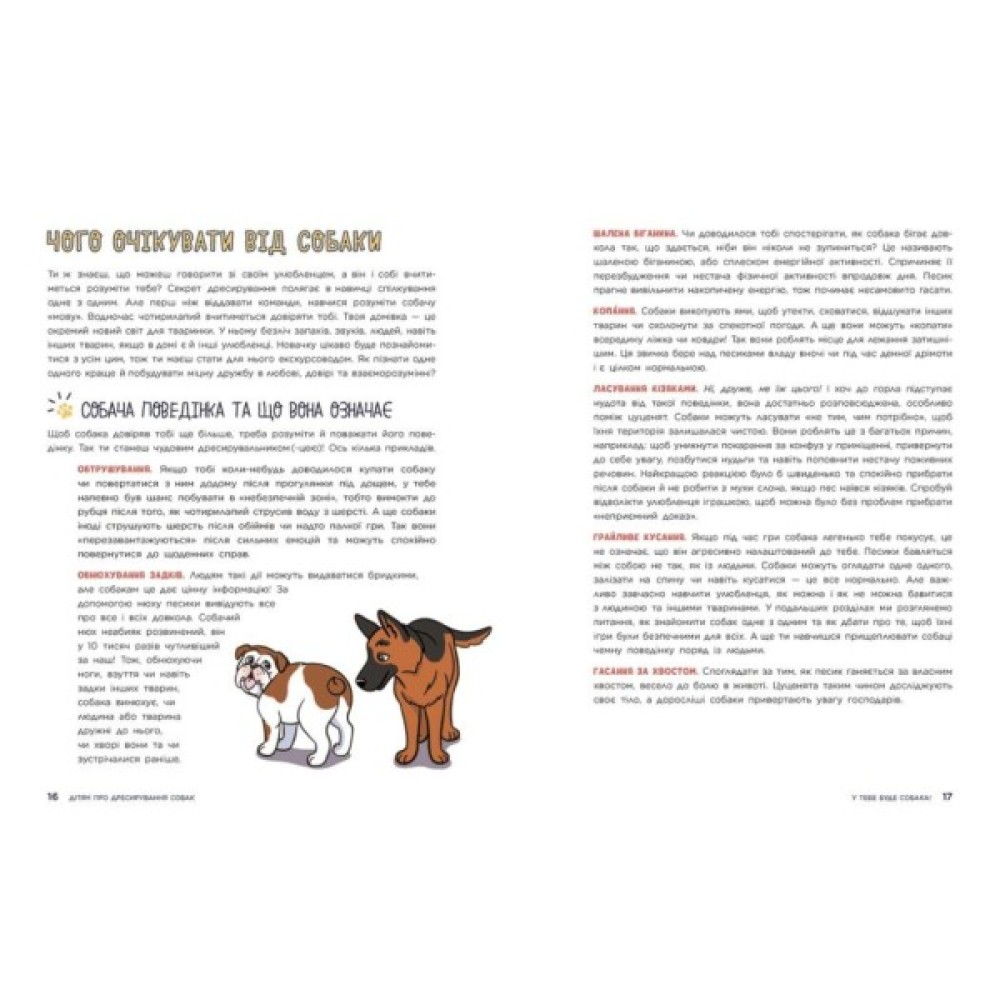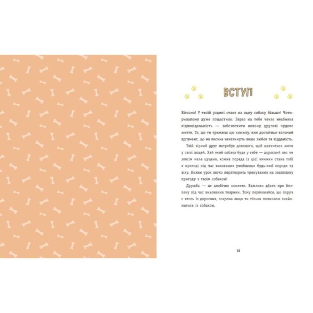 Давно мріяли про собаку й готуєтеся до його появи? Або вже маєте песика й прагнете виховати його чемним і слухняним? Цей посібник з дресирування — джерело корисної інформації: тут знайдуться поради щодо адаптації улюбленця до нового оточення, основні команди й круті трюки, які опанує песик під чуйним керівництвом юних господарів і господинь. Книжка розвине почуття відповідальності, емпатії та турботи про чотирьохлапих і по-справжньому залюбить у процес виховання нового члена родини.