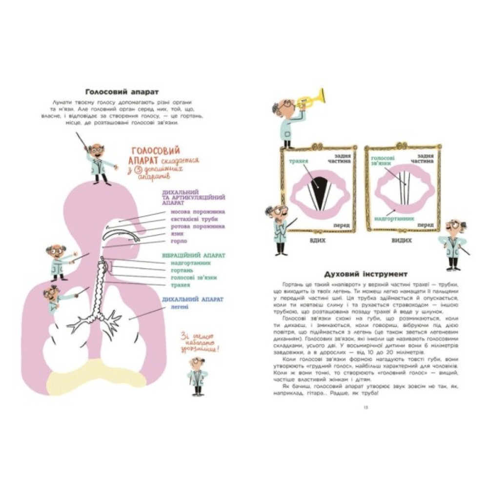 Це енциклопедія для допитливих дітей, які намагаються пізнати своє тіло з усіх сторін. На черзі загадковий голос. Як він утворюється? Чому в когось голос високий, а в когось низький? Чи зміниться він з віком? Як його натренувати й виспівувати ноти? На всі ці запитання у книжці відповідає лікар-фоніатр Франсуа Ле Уш. Зрозумілою дітям мовою він пояснює про дихання й голосові зв’язки, тембр і діапазон, зміну голосу в підлітків, типи голосу від сопрано до басу та навіть про штучний голос роботів.