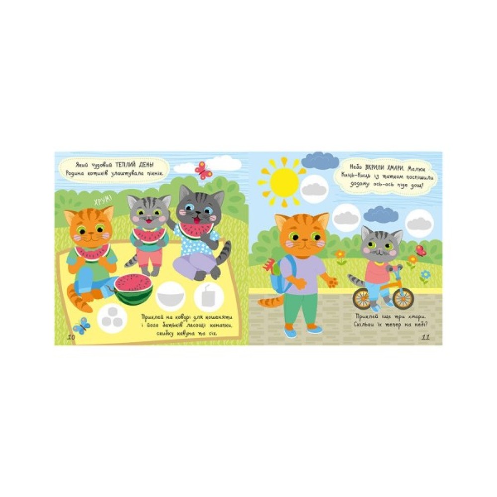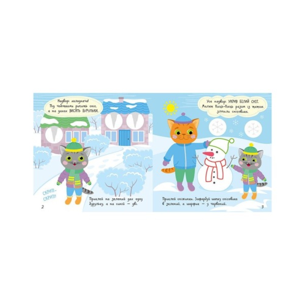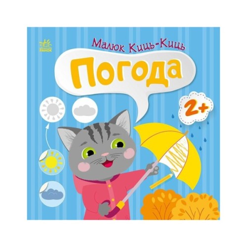 Малюк Киць-Киць обожнює гуляти. І перш ніж вирушити на прогулянку, перевіряє погоду за вікном. Разом із дитиною вони обиратимуть одяг для зимової прогулянки, зафарбовуватимуть парасольку та дощові хмари восени, називатимуть кольори веселки, клеїтимуть іграшки для літньої забави біля моря та ще багато цікавого. Адже в книзі чимало завдань і яскравих наліпок для занять та розваги.