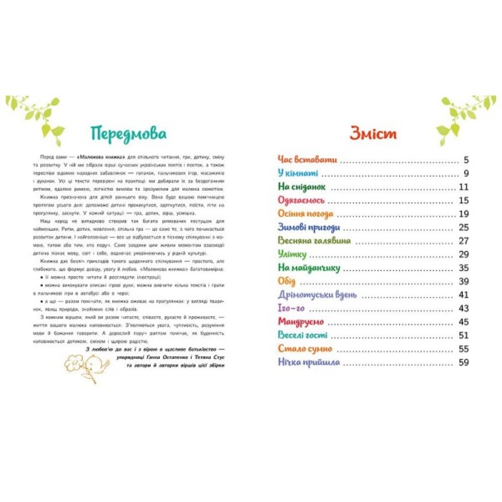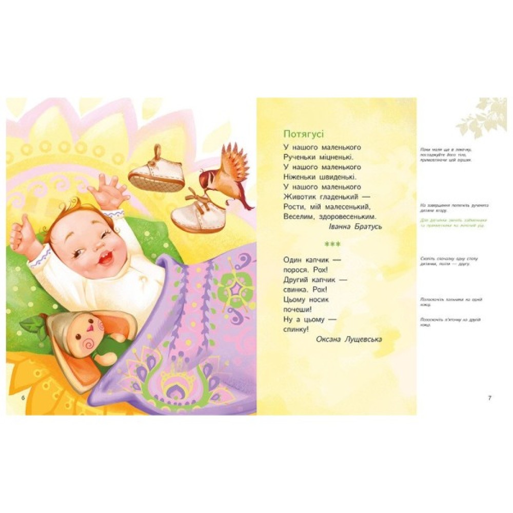 опис вправ, пальчикових ігор, масажів та руханок, які допоможуть вам створити родинні ритуали, що супроводжуватимуть малюка цілий день: під час пробудження та засинання, годування, одягання, прогулянок і ігор.