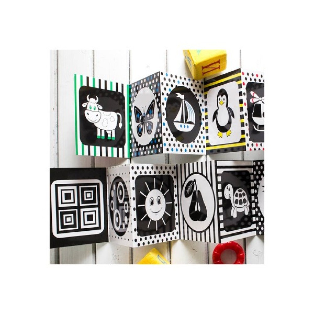 Книжка-розкладка для немовлят із чорно-білими картинками. Вона спеціально створена для розвитку і координації зору та сприйняття у малюків за популярною методикою Сесіль Лупан і Сари Брюер.