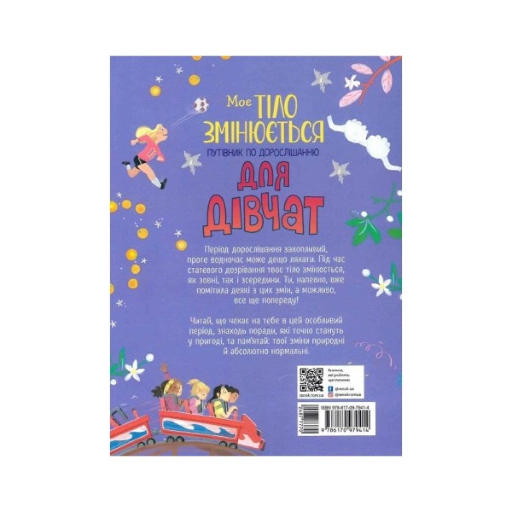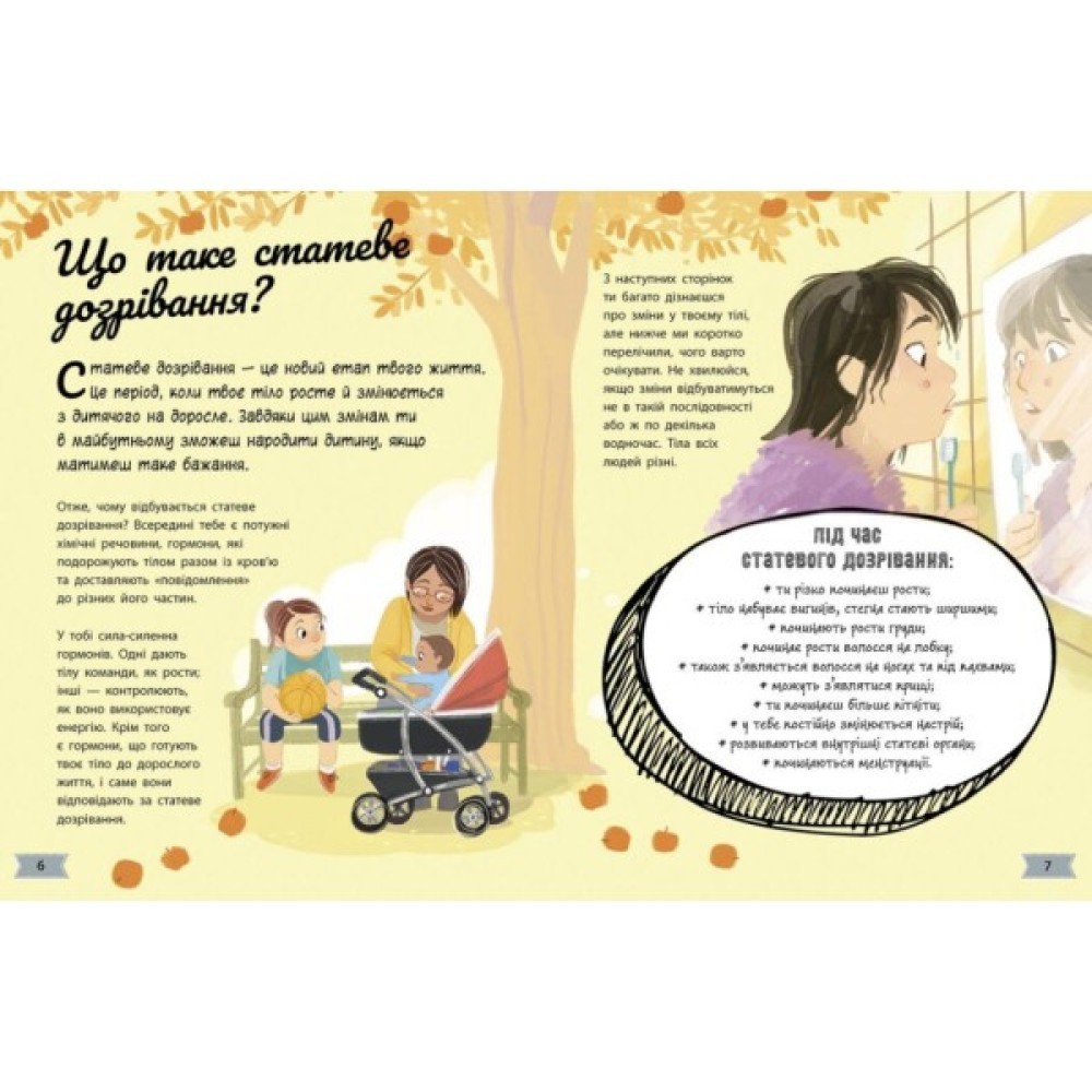 Ти з'ясуєш, що відбувається з твоїм тілом, як зовні, так і зсередини: чому збільшуються груди та з’являється волосся на тілі, що таке менструація і чому твій настрій вмить змінюється від «я всіх вас люблю» до «не хочу нікого бачити»?