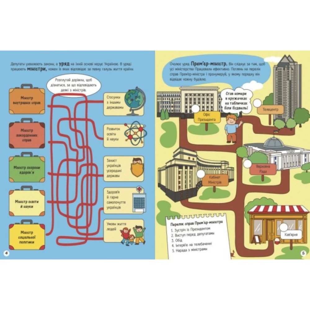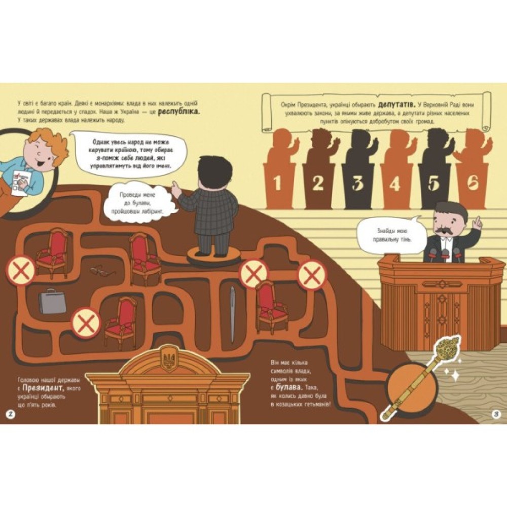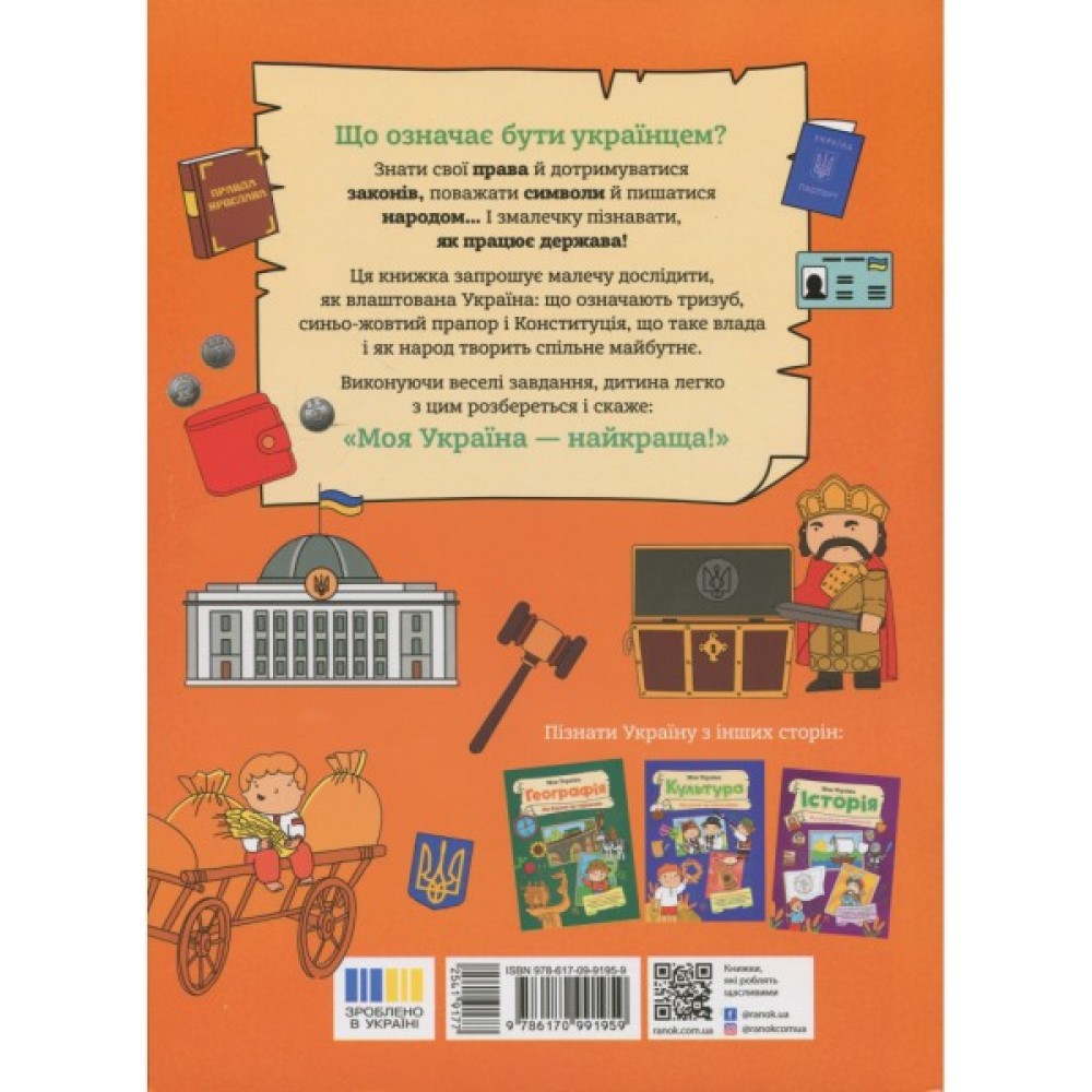 Ця книжка-активіті — перший крок до розуміння нашої державності! Тут малеча дізнається, як функціонує держава, що таке державна символіка, хто такі президенти та як влаштований уряд країни.