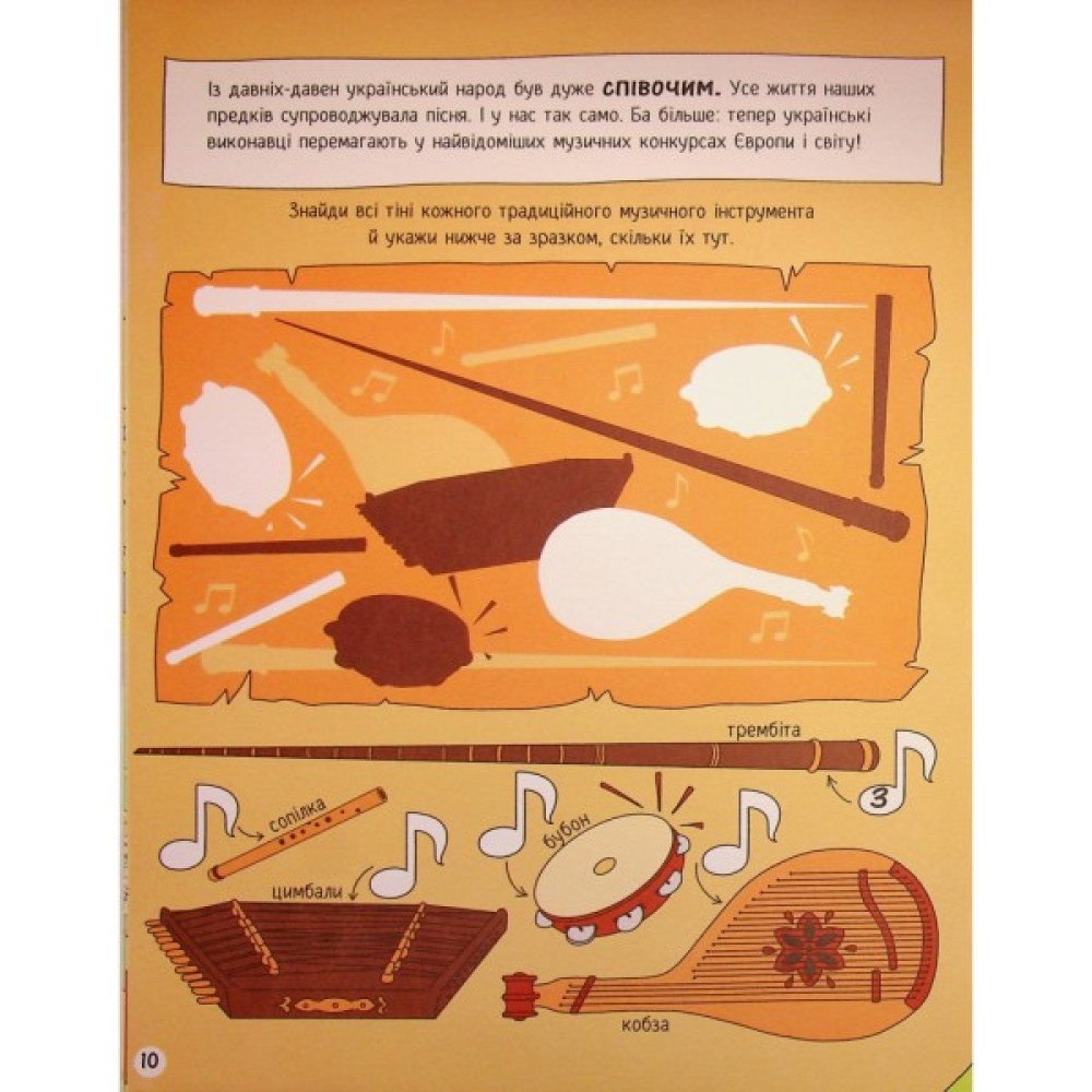 Усна народна творчість, музика, живопис, вишивка й свята — цікаві факти про все це поєднані із завданнями, головоломками, лабіринтами й малювалками для маленьких українознавців.