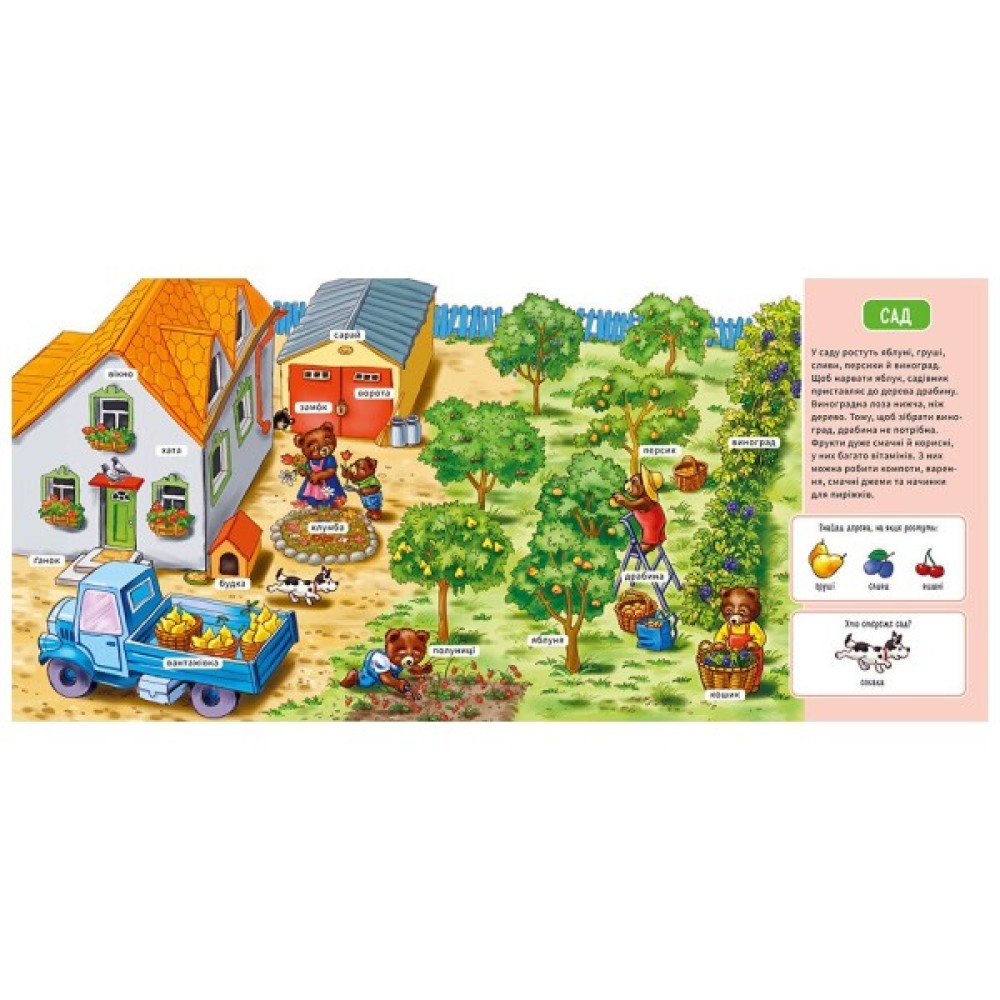 Роздивляючись яскраві малюнки, відкриваючи віконця та виконуючи завдання, малюк дізнається нові слова і швидко почне їх повторювати, познайомиться з навколишнім світом, розвине навички зв’язного мовлення, увагу та мислення.