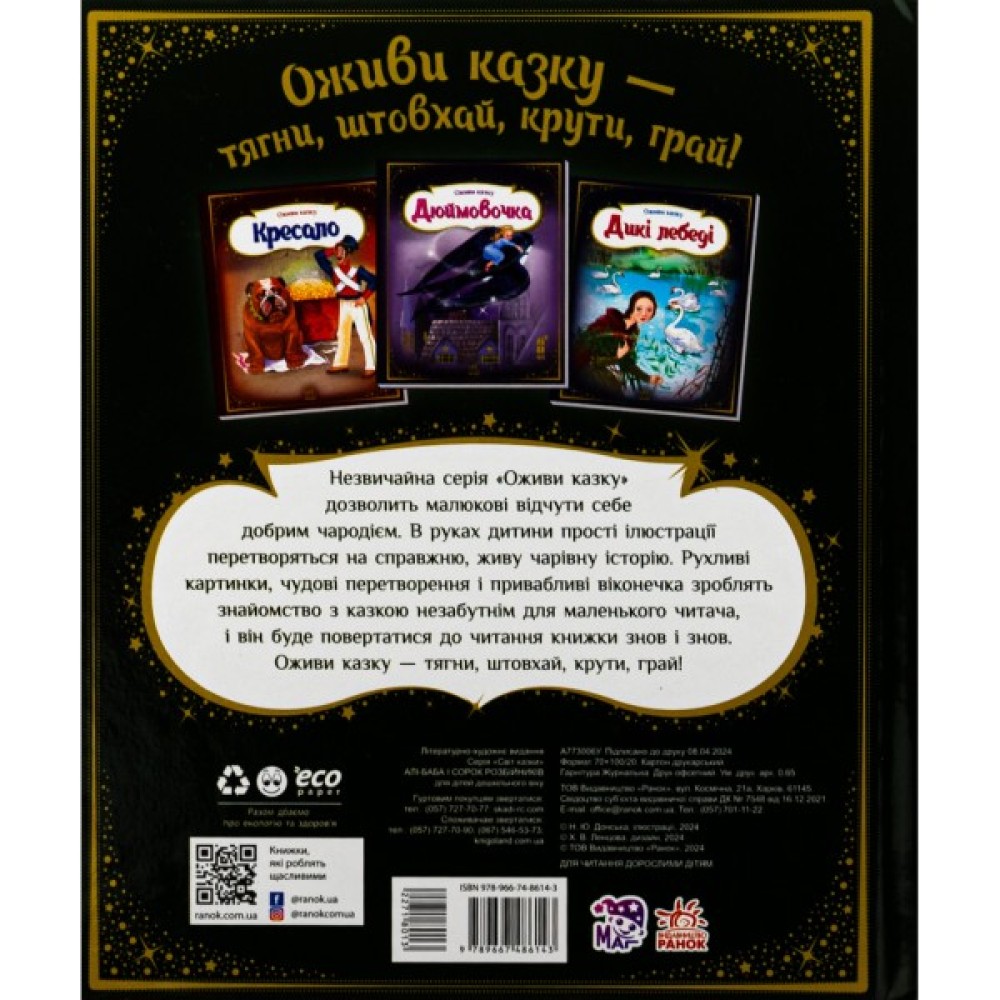 Книжка по мотивам казки "Алі-Баба і сорок розбійників" дозволить малюкові відчути себе добрим чародієм. В руках дитини прості ілюстрації перетворяться на справжню, живу чарівну історію. Рухливі картинки, чудові перетворення і привабливі віконечка зроблять знайомство з казкою незабутнім для маленького читача, і він буде повертатися до читання книжки знов і знов. Оживи казку — тягни, штовхай, крути, грай!