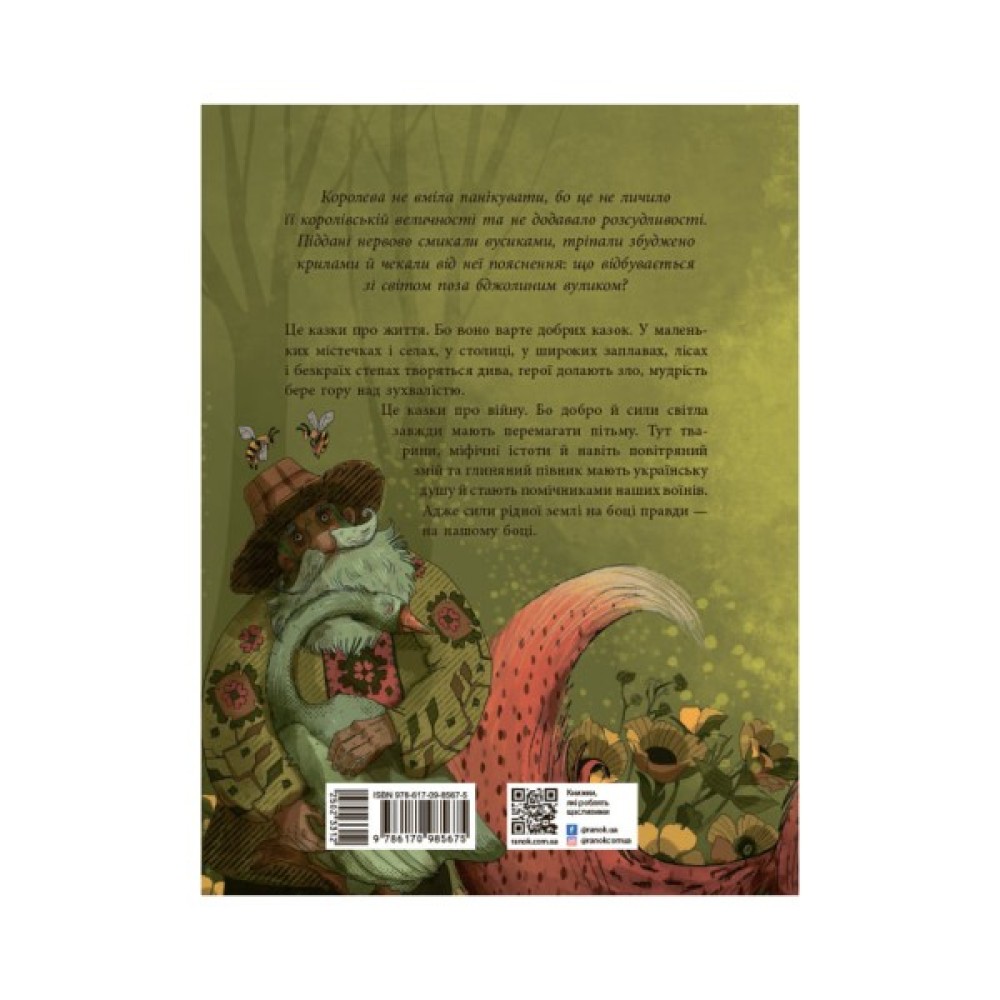 Добрі персонажі цих добрих казок з війни — бджоли, гуси, лис, міфічний і повітряний змії, глиняний півник і навіть бабай із Чорнобаївки — пліч-о-пліч із людьми відстоюють своє майбутнє. Кожен з них надихає своєю сміливістю, відданістю, мудрістю і стійкістю.