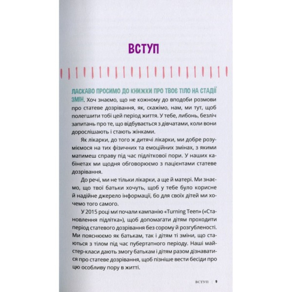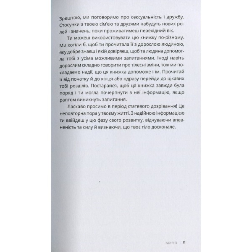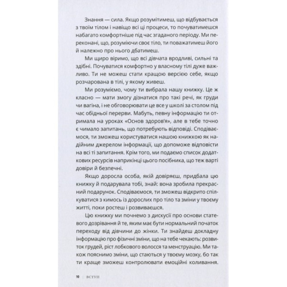 Професійно та по-дружньому авторки говорять про гендер і сексуальність, про самоповагу та стосунки, про те, як протистояти тиску однолітків, і ще про купу важливих речей. Це бодіпозитивний довідник, що допоможе дівчинці віком 10—12 років зорієнтуватися у змінах, які на неї чекають під час статевого дозрівання, і полюбити себе — нову та прекрасну.