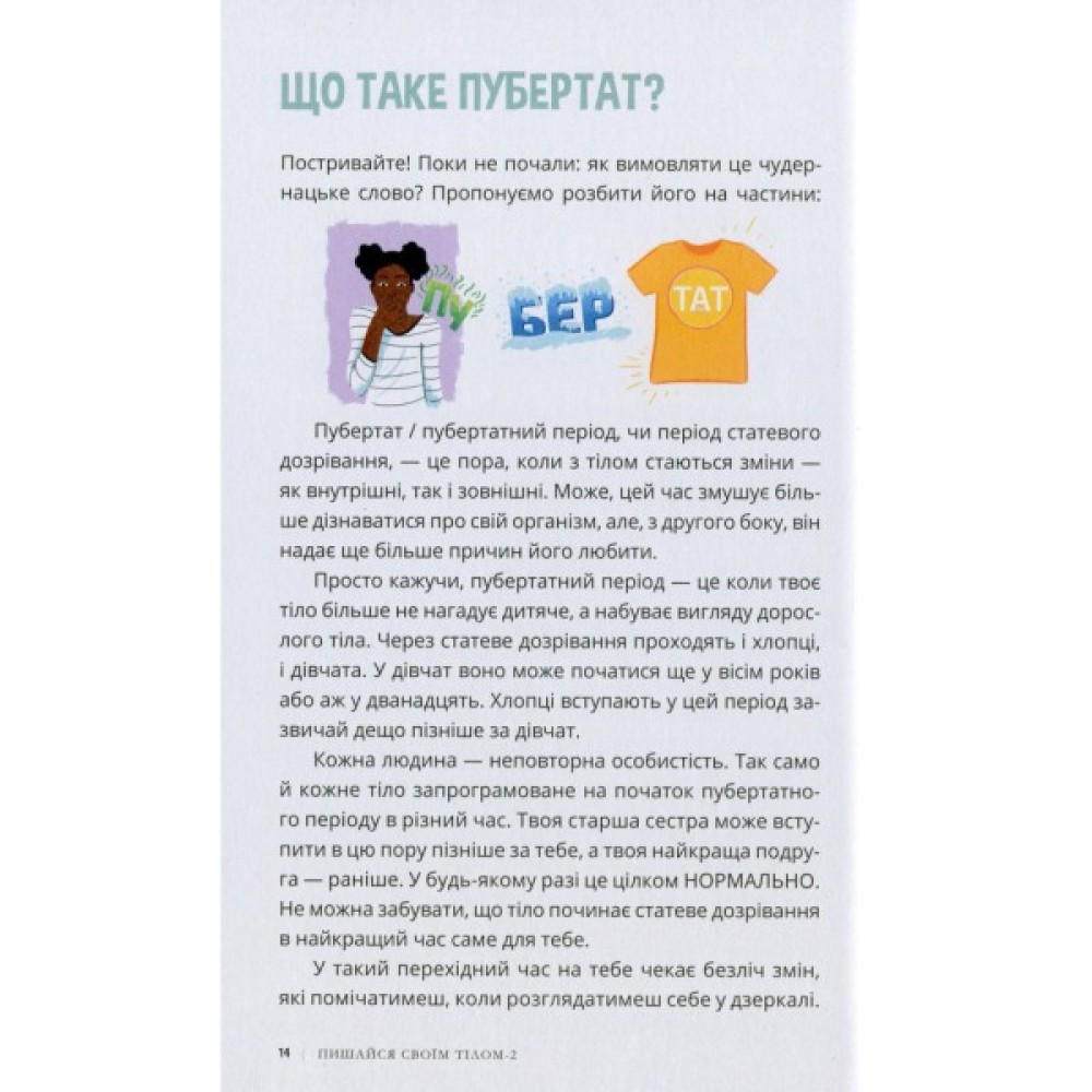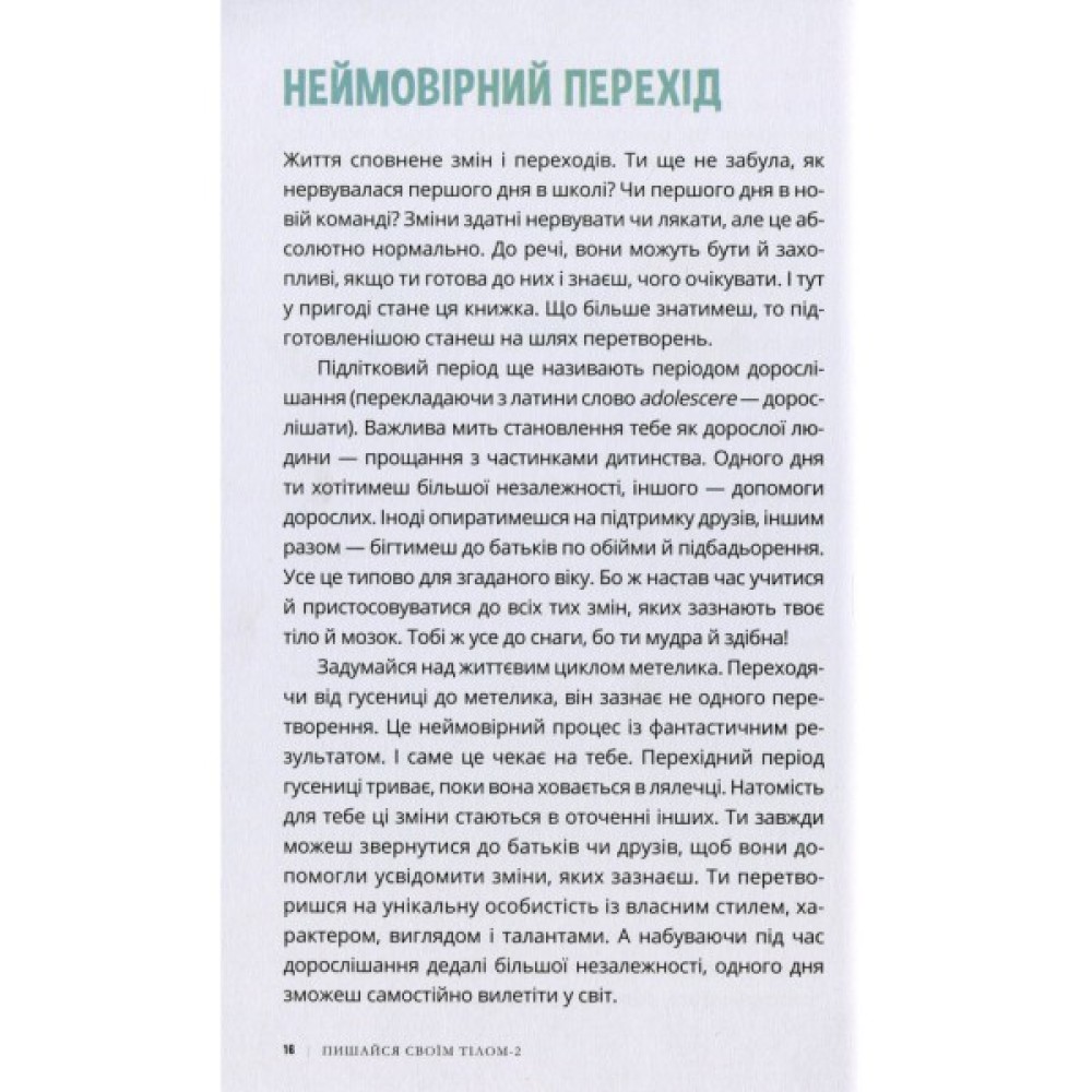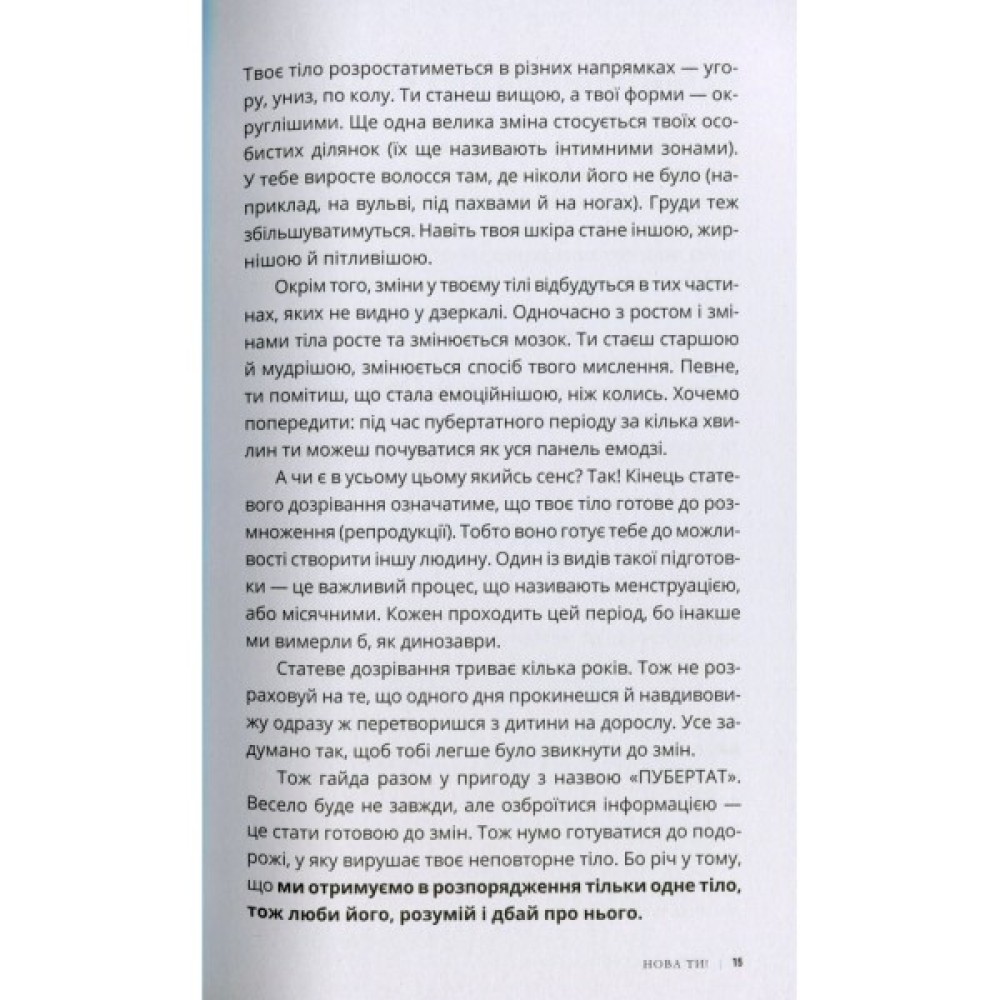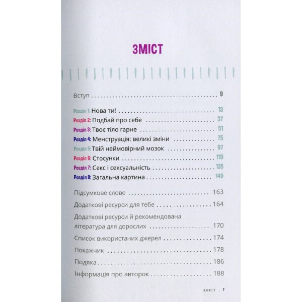 Професійно та по-дружньому авторки говорять про гендер і сексуальність, про самоповагу та стосунки, про те, як протистояти тиску однолітків, і ще про купу важливих речей. Це бодіпозитивний довідник, що допоможе дівчинці віком 10—12 років зорієнтуватися у змінах, які на неї чекають під час статевого дозрівання, і полюбити себе — нову та прекрасну.