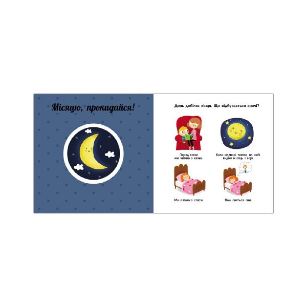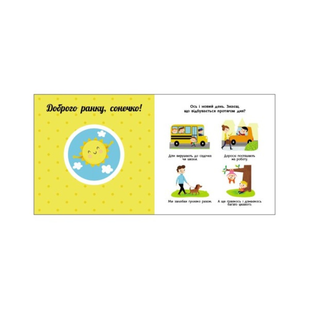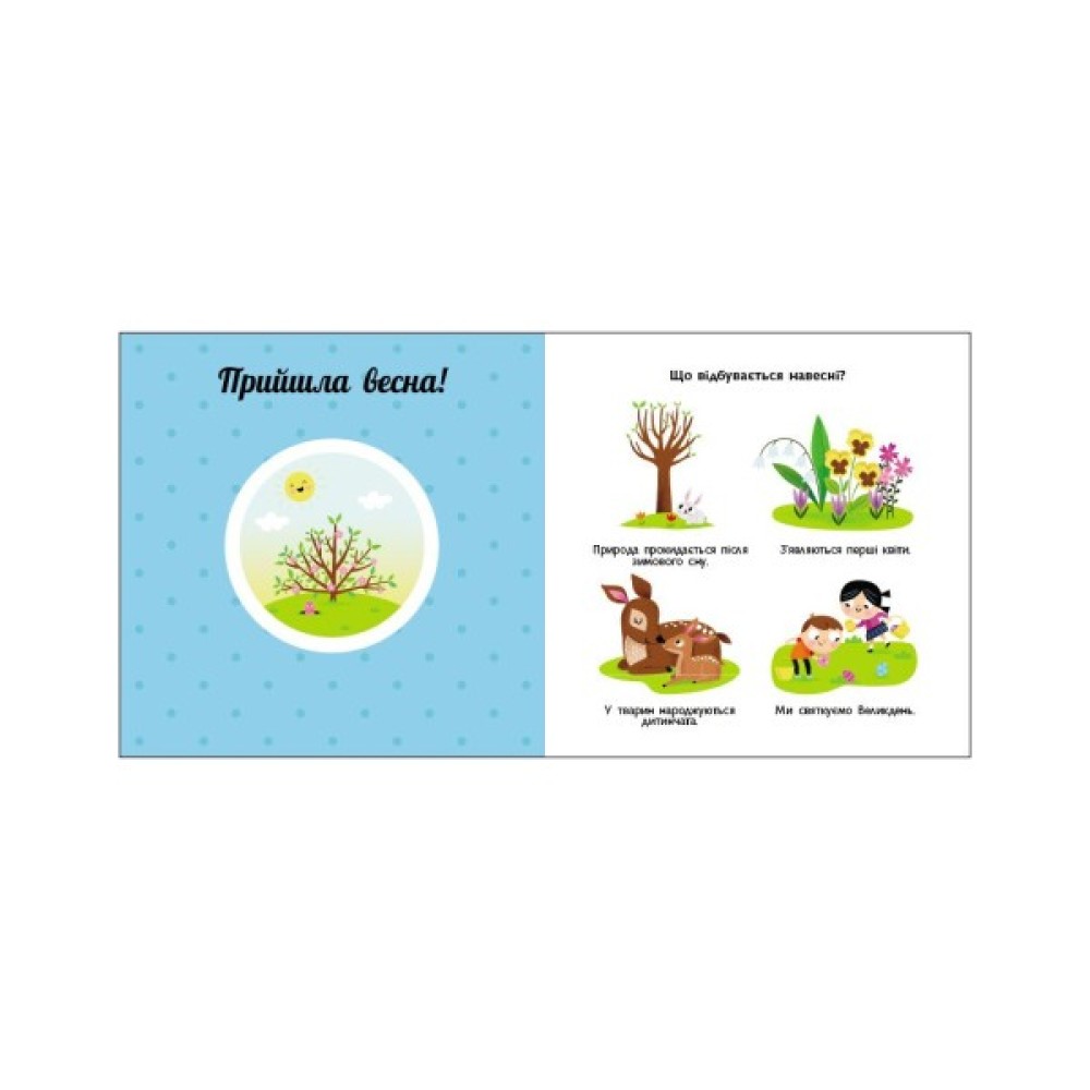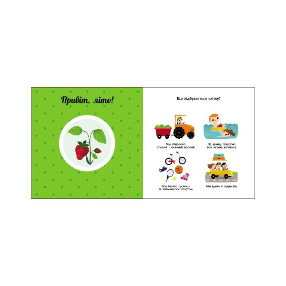 Що ми робимо вдень? А що — вночі? Які пори року ти знаєш? Що відбувається влітку? У яку пору природа засинає? А коли з’являються перші квіти? Обертайте «колесо» та спостерігайте за цими й іншими змінами у природі. Один оберт — і сонечко прокинулося, ще один — і на кущику достигла полуничка… Навчайтеся цікаво й весело з книжками серії!