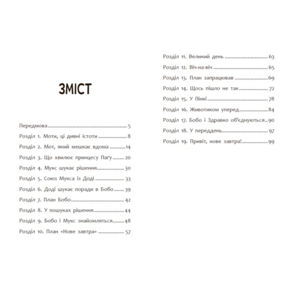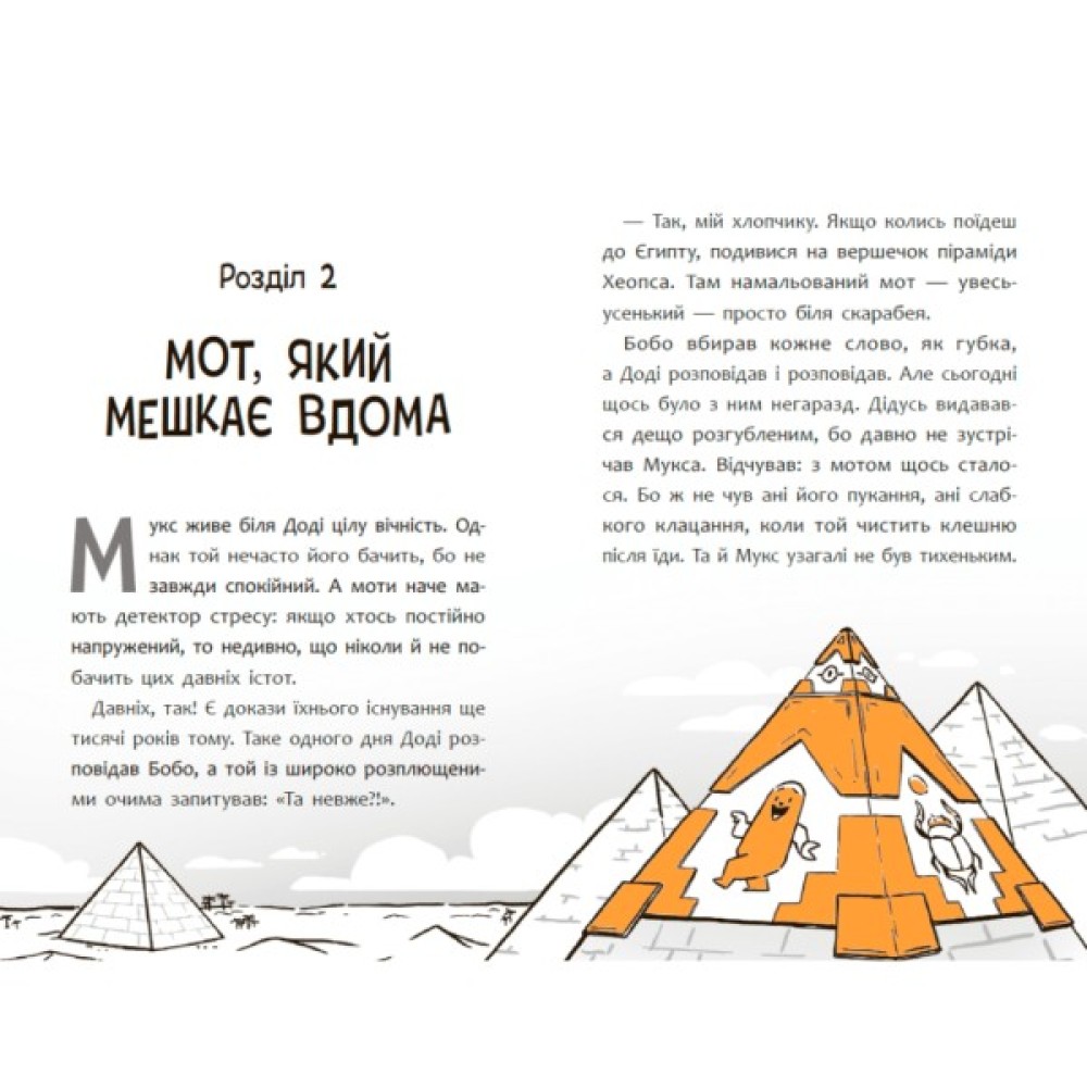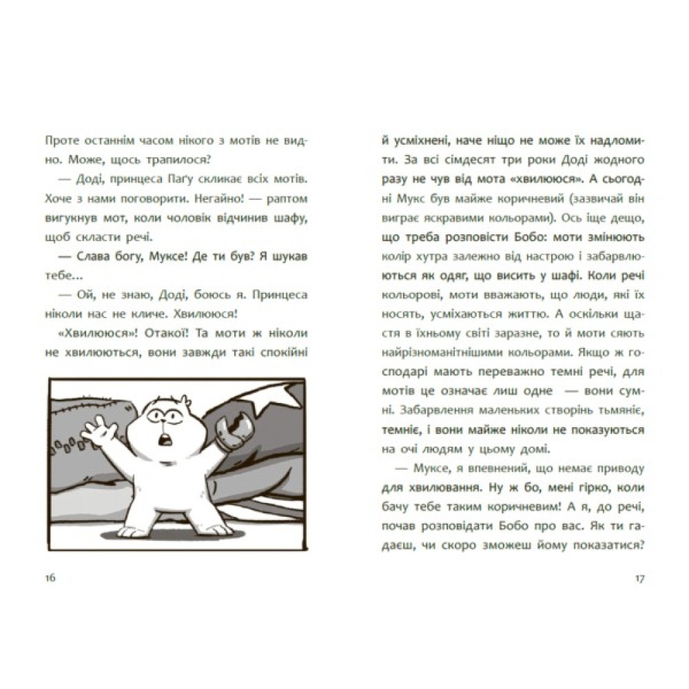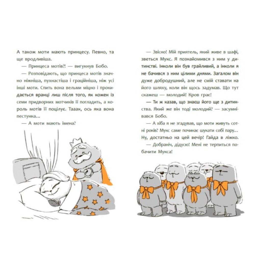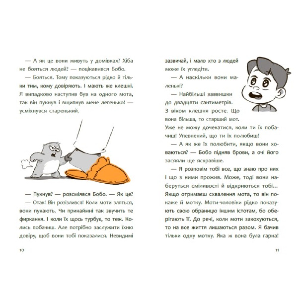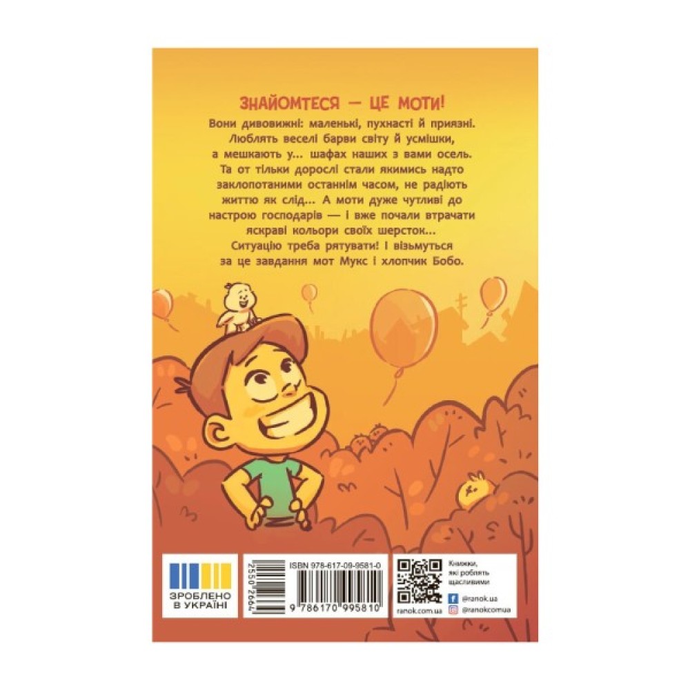 Книжка познайомить молодших школярів зі світом дивовижних створінь — мотів, що мешкають у шафах наших осель. Вони бешкетливі, але водночас дуже добрі, приязні й чутливі. І коли господарі сумні — моти від цього потерпають. Та один хоробрий мот і вигадливий хлопчисько Бобо мають план! Вони хочуть його втілити, щоб усі посміхалися трохи більше, а життя стало трохи яскравішим.