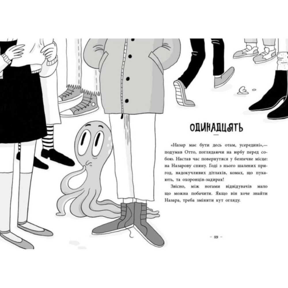 Нові пригоди Назара та його друга-восьминога. Якщо ви читали попередні книги, то знаєте, що то не простий восьминіг, а магічне татуювання, яке оживає, щойно його тричі вщипнути. Цього разу, здавалося, обійдеться без халепи. Чудового дня Назар вирушає на екскурсію до Музею науки та еволюції. Та чи буває так, щоб вони з другом не втрапили у пригоду? Спочатку вони дістаються вокзалу за допомогою візка із супермаркету, а тоді й узагалі гублять одне одного у музеї. У фіналі чекайте на неймовірне розкриття музейної таємниці!