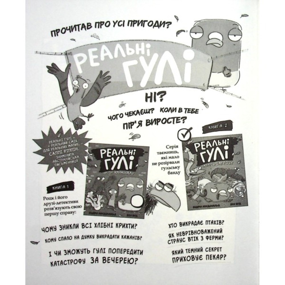 Неймовірні, курлиКРУТІ, а головне — абсолютно реальні гулі на варті закону! Бачиш голубів на підвіконні чи на автобусній зупинці? Дуже ймовірно, що саме зараз вони розслідують злочин століття і захищають тебе від лютих поганців. Адже ці пташки — найкращі детективи, бо хто ж зважатиме на голубів, яких повно в міському парку, на дахах і деревах?