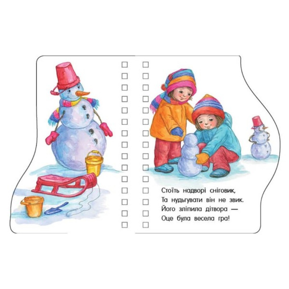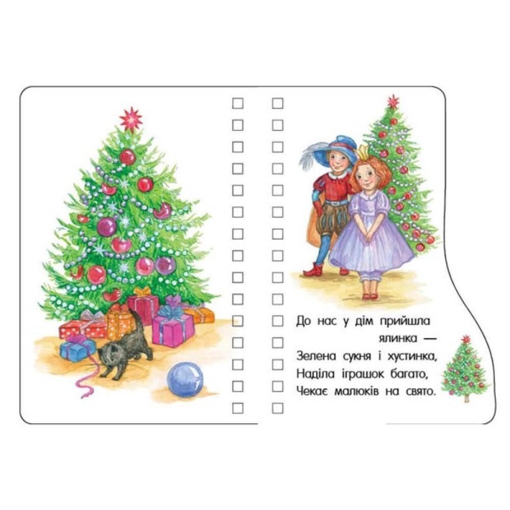 Ця книжка має незвичайний формат: завдяки фігурно обрізаним сторінкам святкові герої та предмети ніби визирають один з-за одного. Добрі вірші, яскраві ілюстрації, оригінальний формат обов’язково захоплять вашого малюка. Книжка «Новий рік» подарує святковий настрій, а віршики з неї можна вивчити й потім розповісти Миколаю! Нехай дитина пізнає світ із «Першими кроками»!