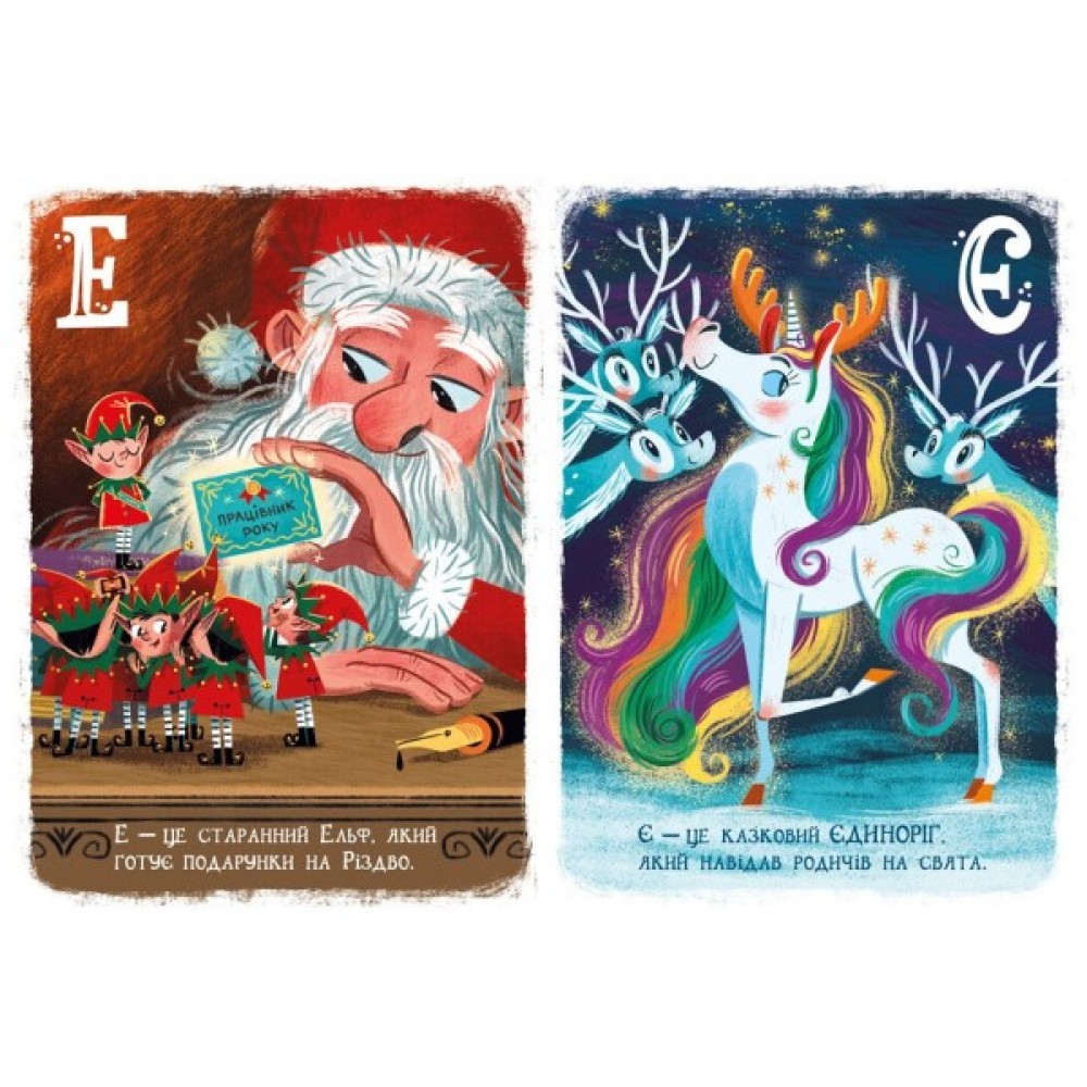 Подарункового формату зі стильними ілюстраціями Катерини Підлісної. Кожна сторінка присвячена одній букві, до якої є предмет, емоція, подія різдвяно-новорічної тематики. Дитина розглядатиме абетку і не просто вивчатиме букви - вона з задоволенням буде переживати святкові емоції і збагачувати свій словниковий запас.