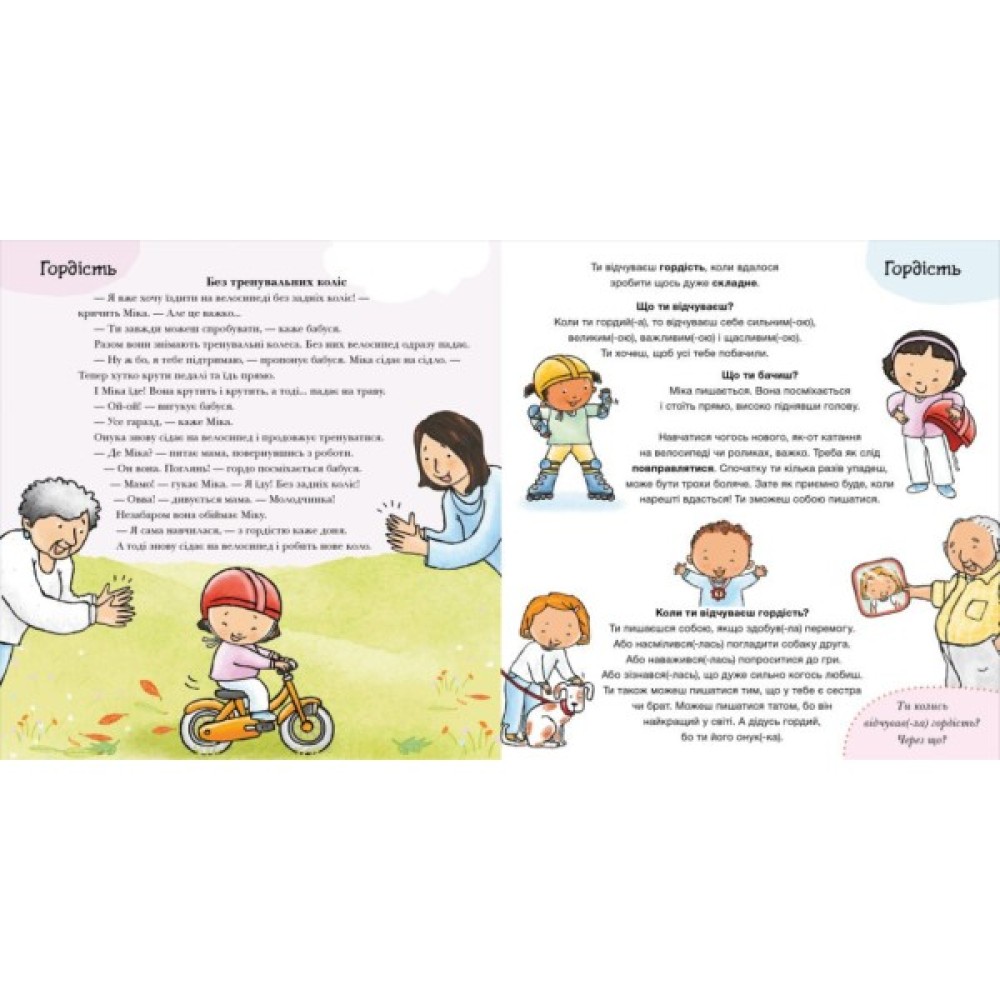 - Кожен розворот - це: повчальна міністорія; кілька порад до ситуацій, пов'язаних із темою; окрема тема, присвячена почуттю або відчуттю, з яким дитина краще познайомиться, опрацювавши розворот.
