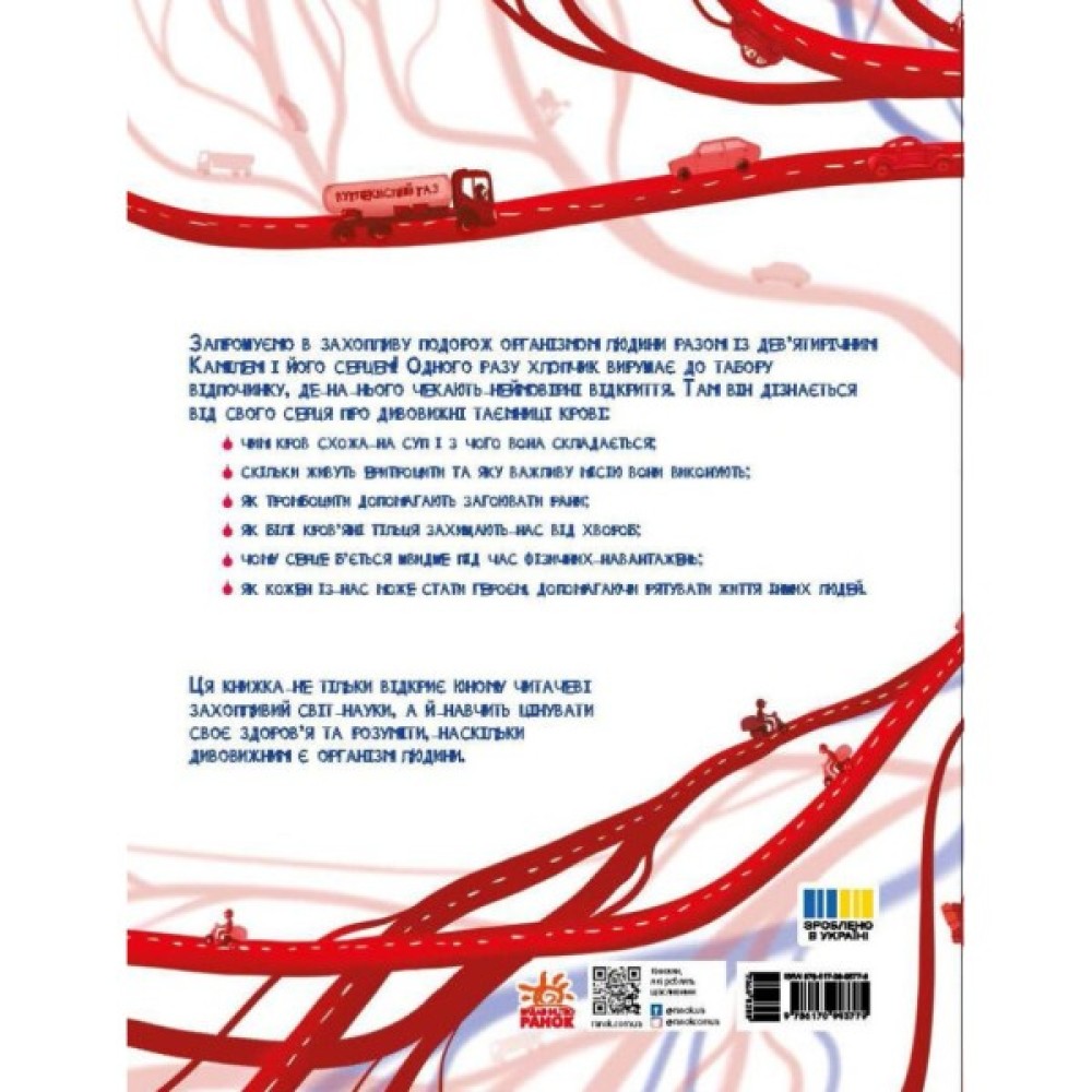 Одного разу хлопчик вирушає до табору відпочинку, де на нього чекають неймовірні відкриття. Там він дізнається від свого серця про дивовижні таємниці крові: чим кров схожа на суп і з чого вона складається; скільки живуть еритроцити та яку важливу місію вони виконують; як тромбоцити допомагають загоювати рани; як білі кров’яні тільця захищають нас від хвороб; чому серце б’ється швидше під час фізичних навантажень; як кожен із нас може стати героєм, допомагаючи рятувати життя інших людей.
