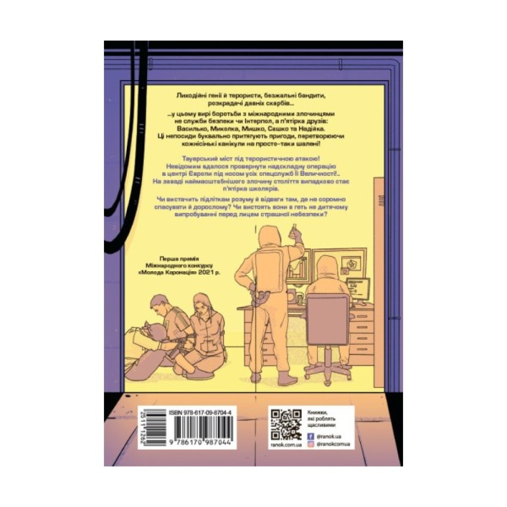 Тауерський міст під терористичною атакою! Невідомі розпилили радіоактивний порошок у самому серці Лондона під носом усіх спецслужб Її Величності!Власне, п’ятірка не планувала рятувати світ від лиходійного генія-терориста. Взагалі ні про що таке вони й не думали. Просто були канікули. Просто Мишко випадково забрів на покинуту пасіку. І хто ж винен, що він побачив там дещо страшенно цікаве. І втягнув у пригоду всіх друзів! І пригода дуже скоро перетворилась на серйозну протидію справжнісіньким зловмисникам. І чи впораються підлітки там, де дорослі пасують?Як терористам вдалося провернути таку надскладну операцію в центрі Європи?.. Сліди лиходіїв ведуть в Україну. І на заваді наймасштабнішого й найзухвалішого злочину століття випадково стає п’ятірка школярів. Чи вистачить підліткам розуму й відваги там, де не соромно спасувати й дорослому? Чи збережуть вони віру одне в одного та власну дружбу в складному й геть не дитячому випробуванні перед лицем страшної небезпеки?