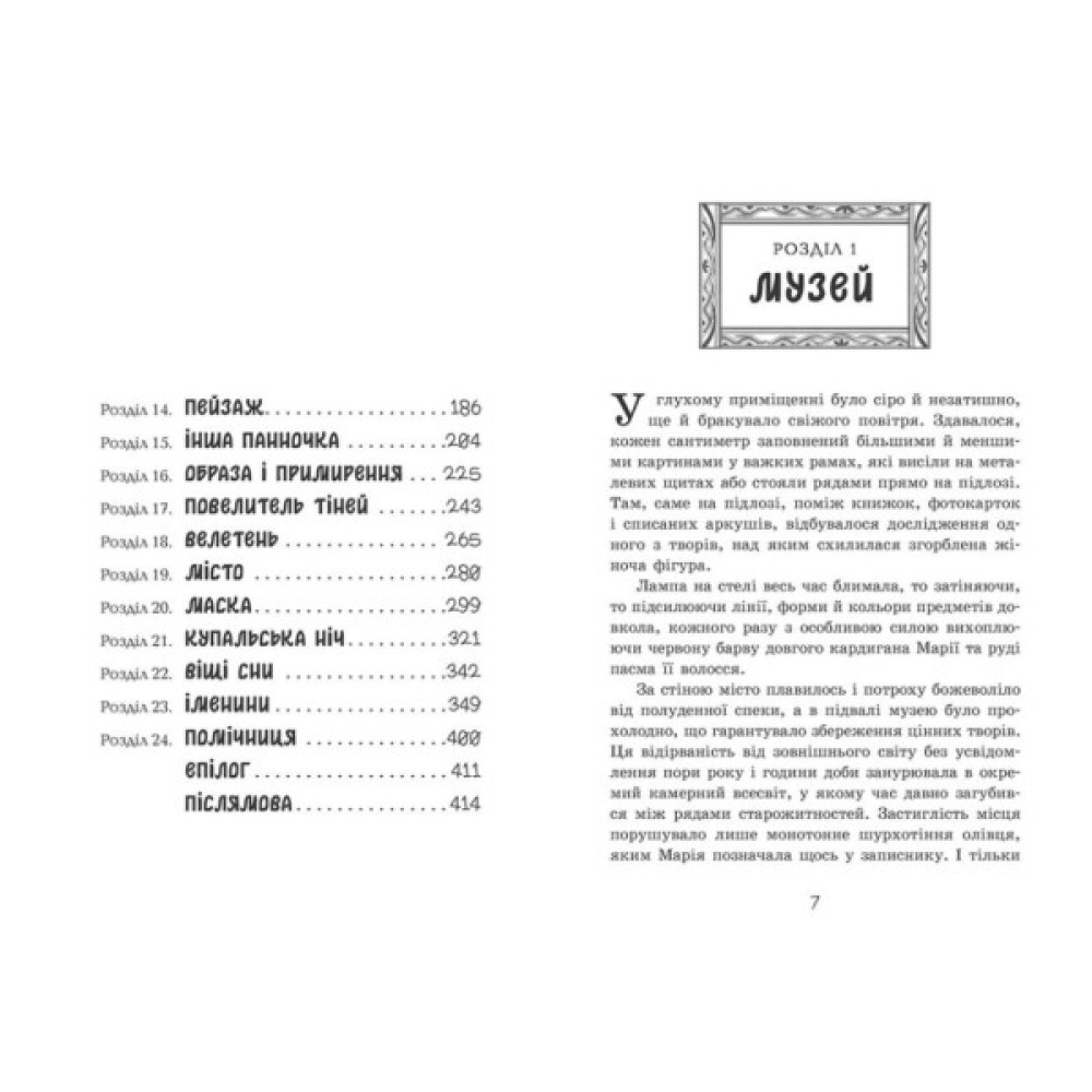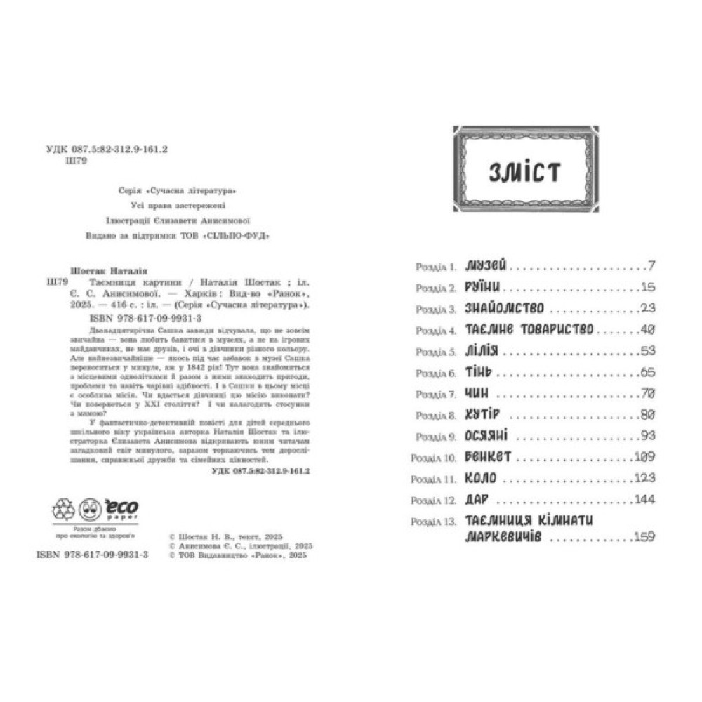 Дванадцятирічна Сашка ніяк не може вписатися у «звичайне» життя. Її ваблять не ігрові майданчики, а музеї, стародавності й таємничі картини… І не дарма: одна з них виявляється справжнім порталом — і затягує дівчинку в минуле, аж у 1842 рік. І ця епоха, здається, підходить дівчинці значно більше. Тут, де міфи живуть поруч з історією, Сашка приятелює з місцевими однолітками, знаходить з ними пригоди й проблеми та… відкриває свої чарівні здібності! У цьому місці вона має особливу місію. Та чи вдасться її виконати, коли на кожному кроці чекають грізні чари? Чи зможе Сашка розгадати таємницю картини, щоби повернутися додому, чи назавжди залишиться її частиною?