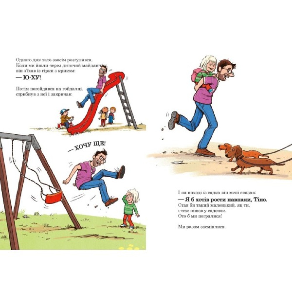 Дівчинці на ім’я Тіна п’ять років, і вона ходить до дитячого садочка. А це – її дорослий непосидючий татко, який полюбляє гратися. Тато Тіни мріє знову стати малим, аби ходити у дитсадок разом з донькою і одного разу… його бажання справджується!